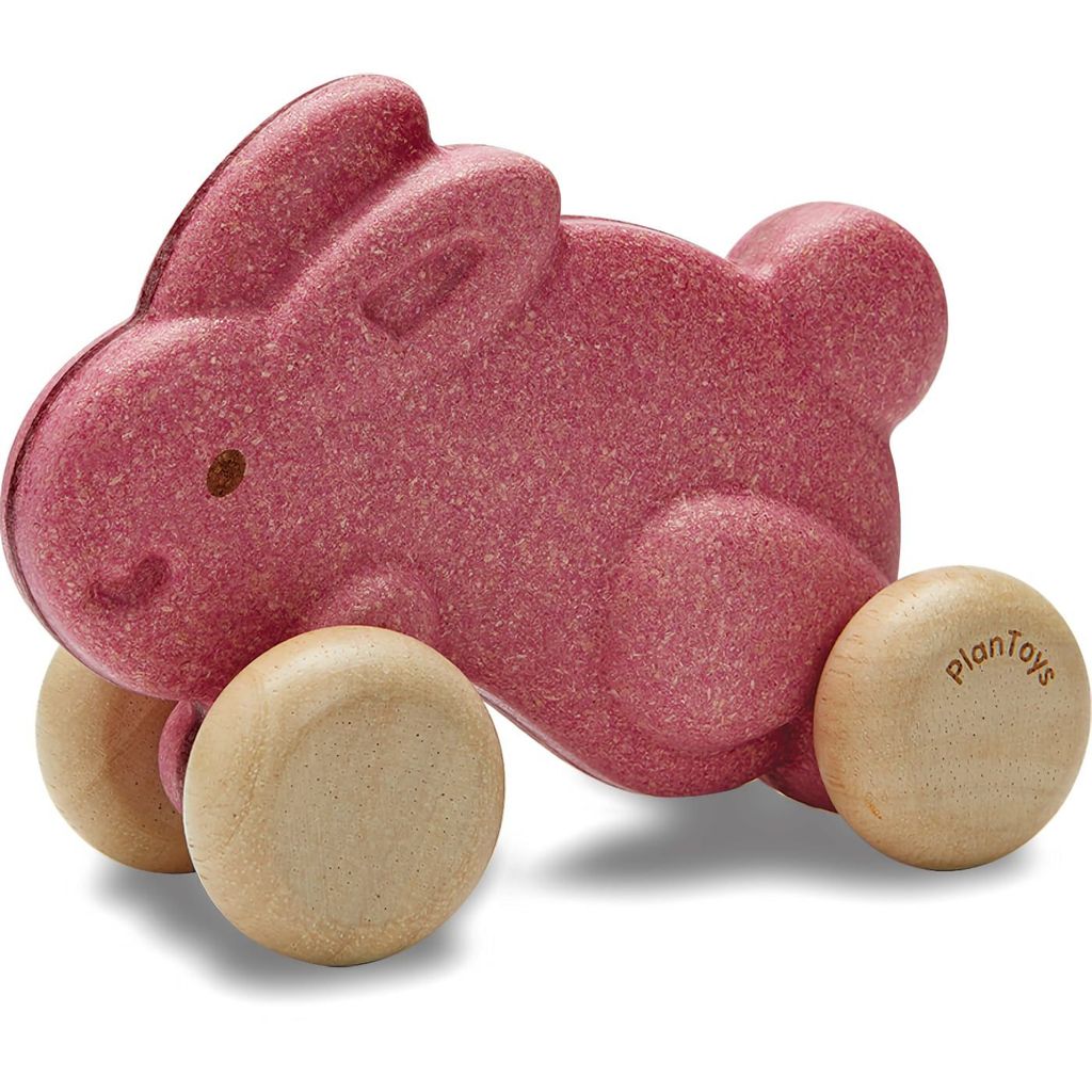 Push Along Bunny fra PlanToys er et trælegetøj fremstillet af PlanWood, PlanToys' eget materiale, der består af genanvendt savsmuld, giftfri lim og økologisk lyserød maling.