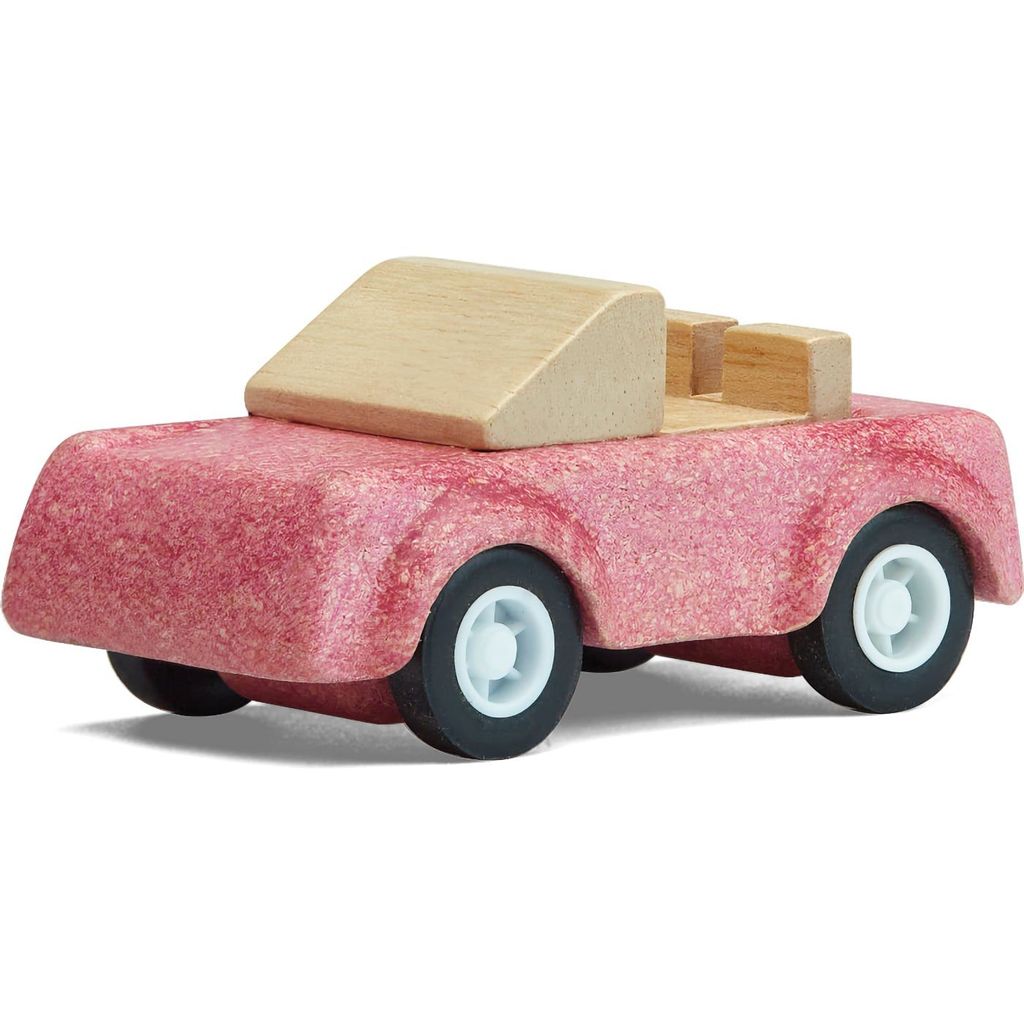 PlanToys pink sportsvogn i træ (cabriolet) og PlanToys' eget materiale PlanWood, som er en blanding af savsmuld, giftfri lim og organiske farver. Den fine sportsvogn er 6,4 cm lang og har gummidæk, som giver et godt rul og greb på de fleste gulve. Legetøjsbilen fra PlanToys er af høj kvalitet og er en rigtig fin træbil, som bør stå på ethvert legeværelse, når der skal køres en tur ned ad bakken.