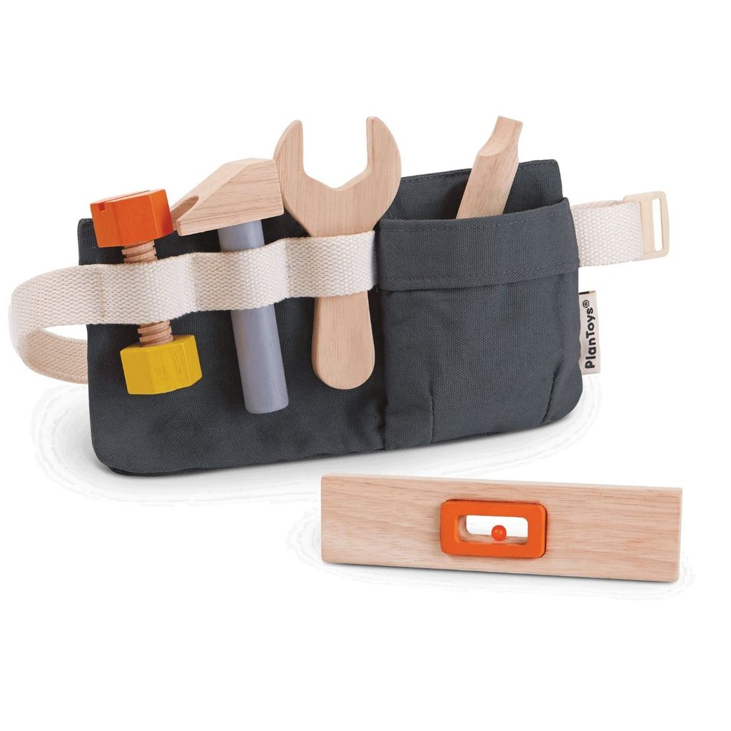 Værktøjsbælte fra PlanToys med træværktøj. Perfekt at have ved hånden, når den lille reparatør skal reparere noget i hjemmet.