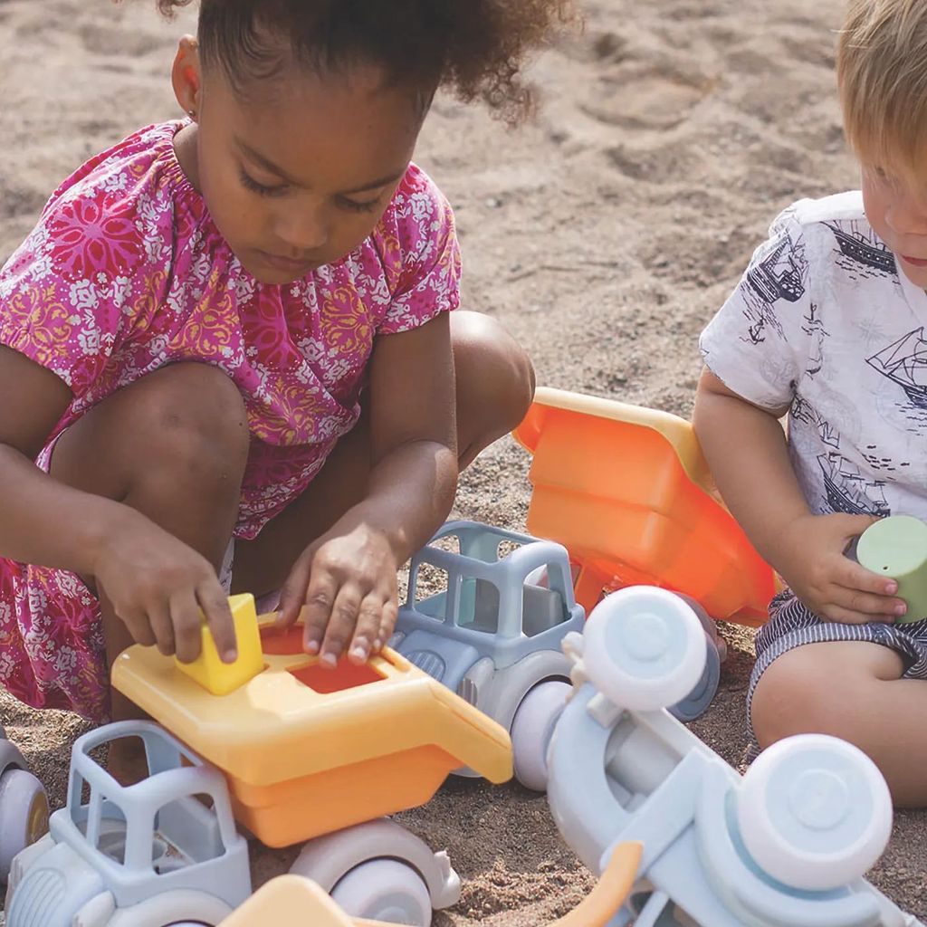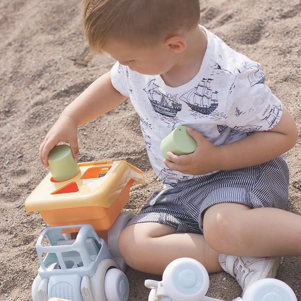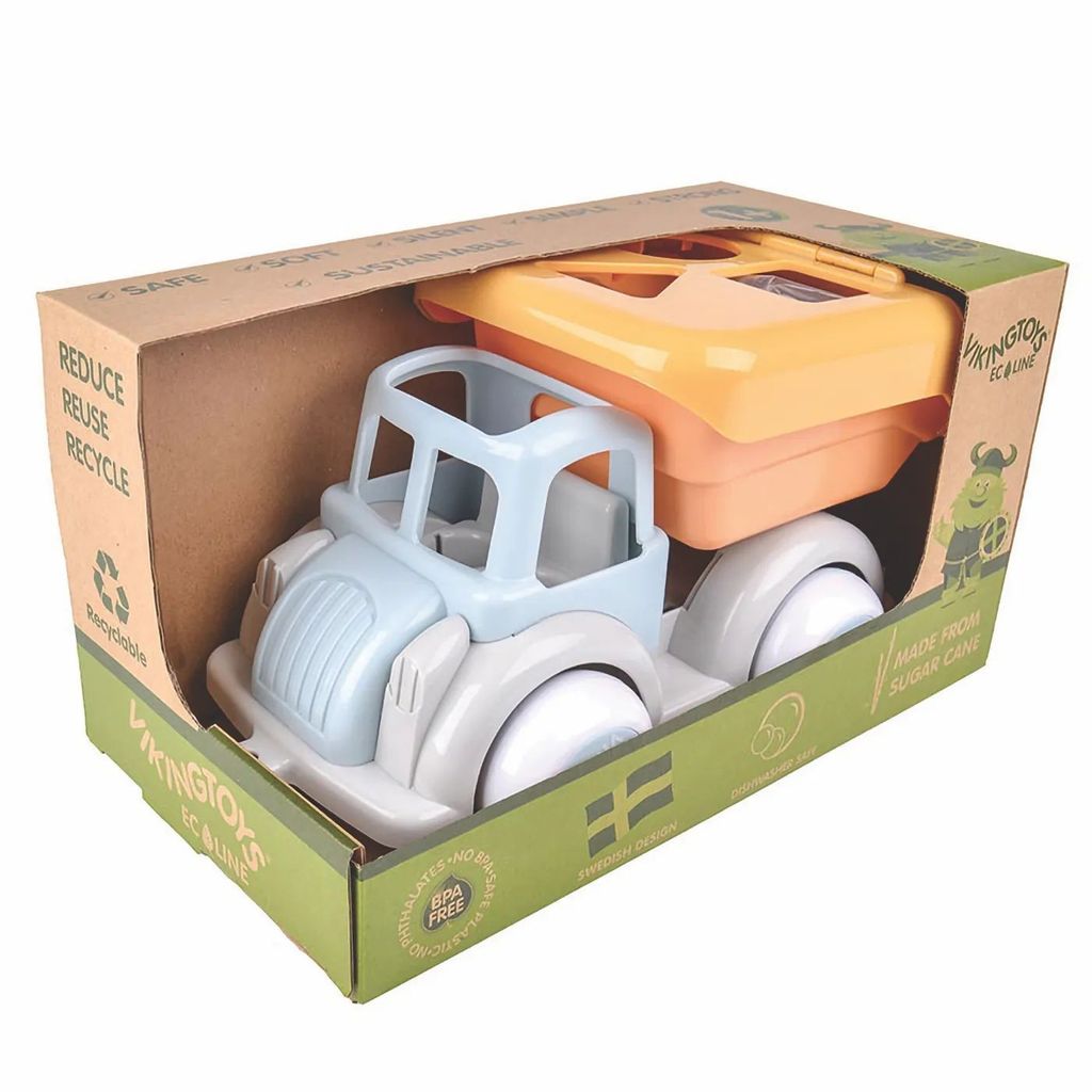Pick-up truck / pick-up box / lastbil med tre geometriske figurer, der passer ind i den tilsvarende åbning i ladet. Pick-up'en er en del af Ecoline-serien fra Viking Toys. Ecoline betyder, at legetøjet er fremstillet af vedvarende materiale, der reducerer CO2-udledningen og er 100 % genanvendeligt.