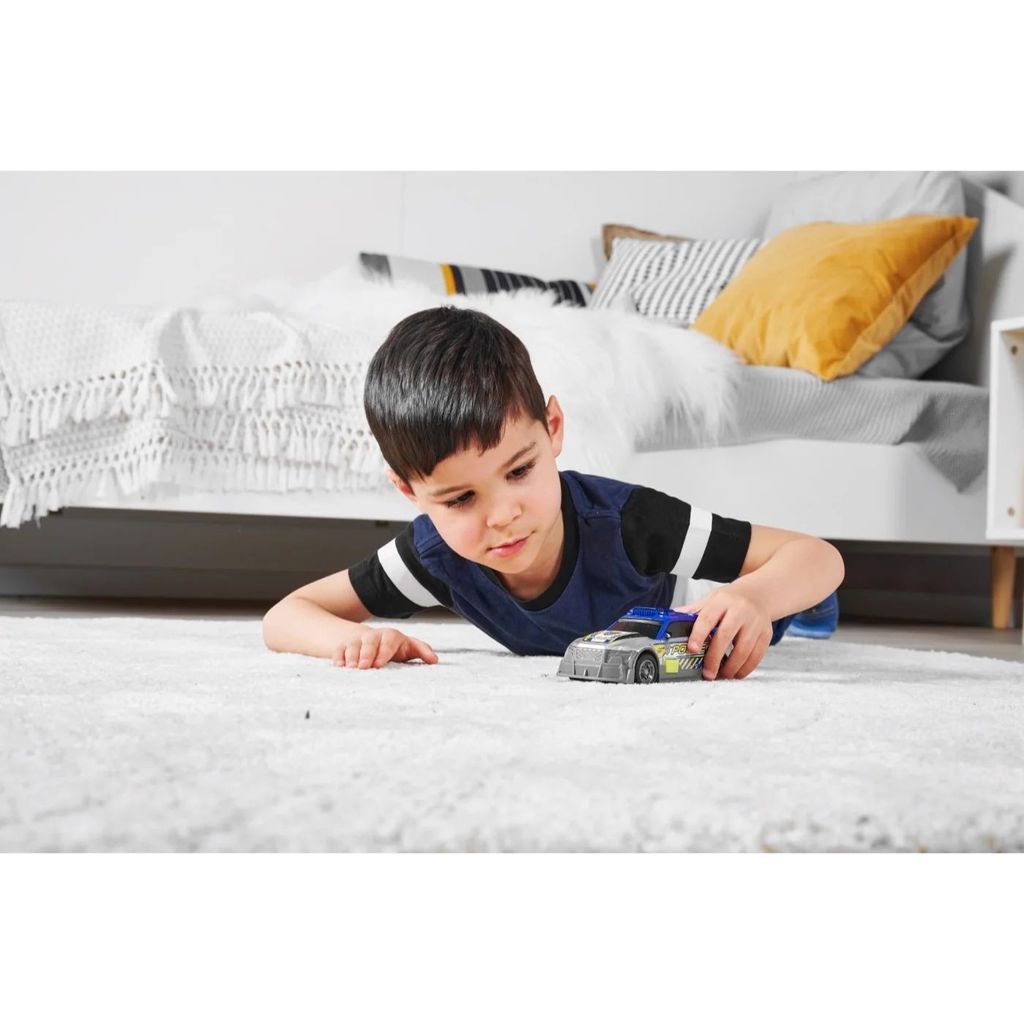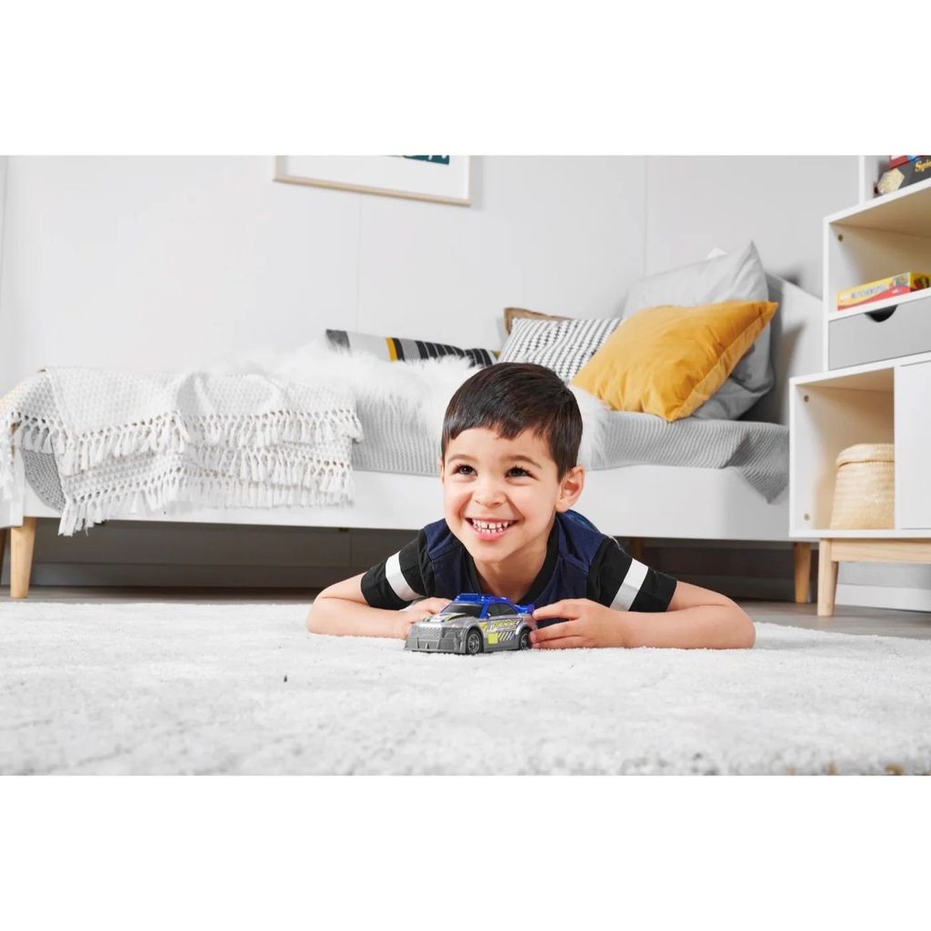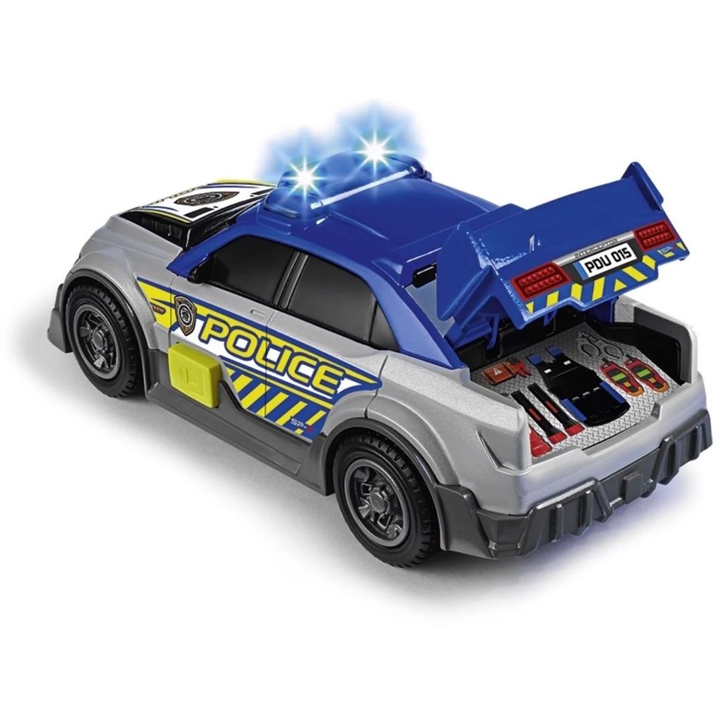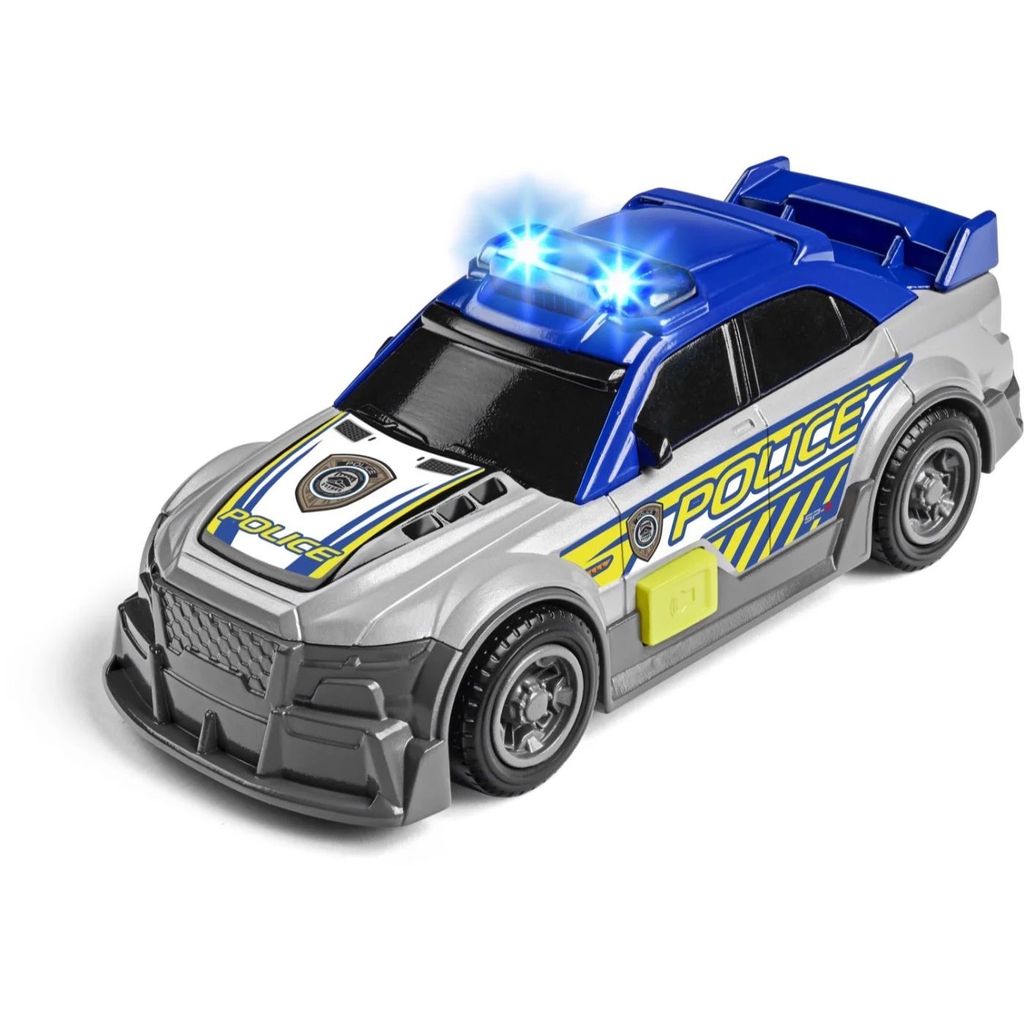 Politibilen fra Dickie Toys er en grå/sølvfarvet politibil med lyd og lys og en bagklap, der kan åbnes og måler 15 cm.