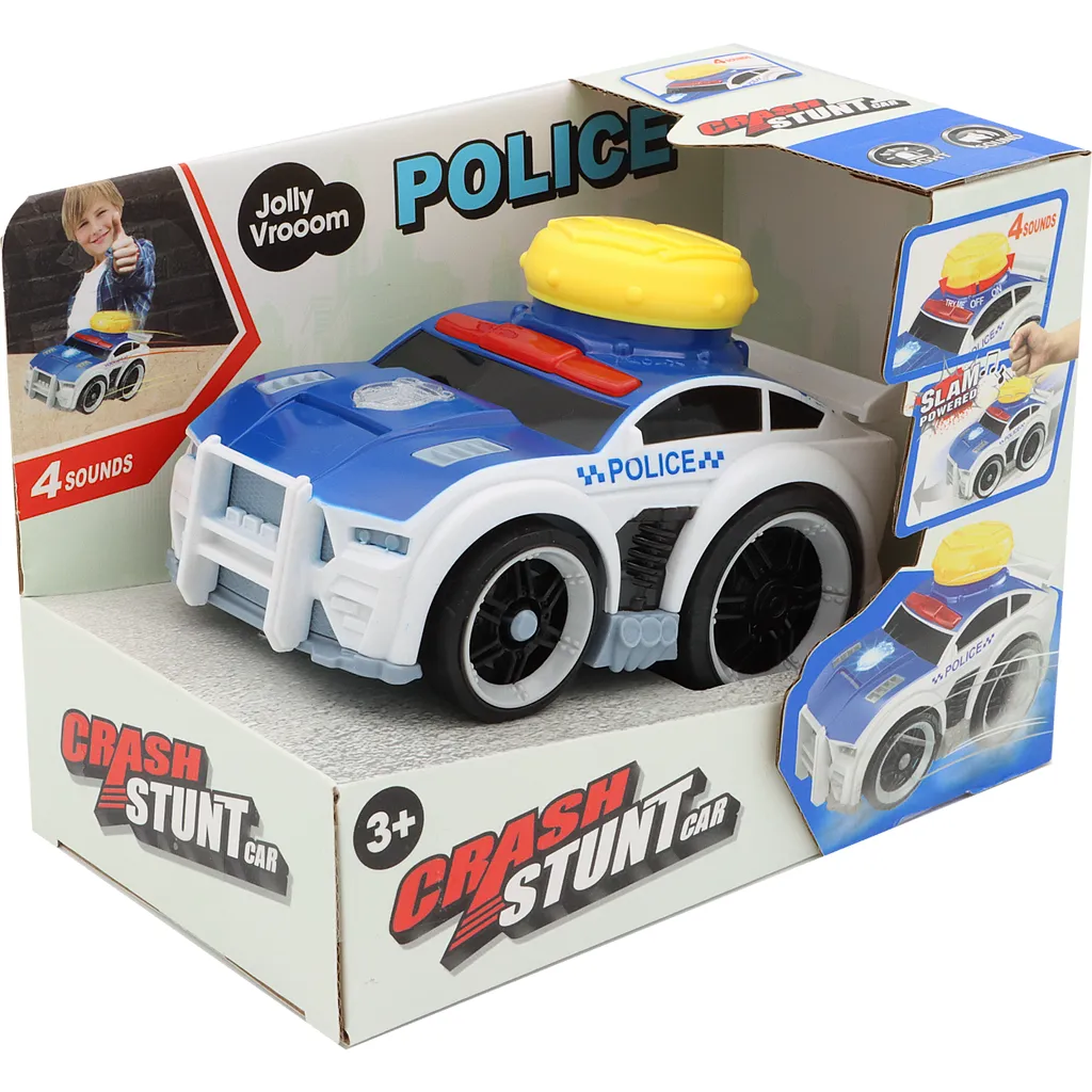 En politibil, som du kan køre frem og tilbage med hånden eller trykke på en stor gul knap på taget, så kører bilen af sig selv, afspiller et signal og blinker med et skilt på motorhjelmen.