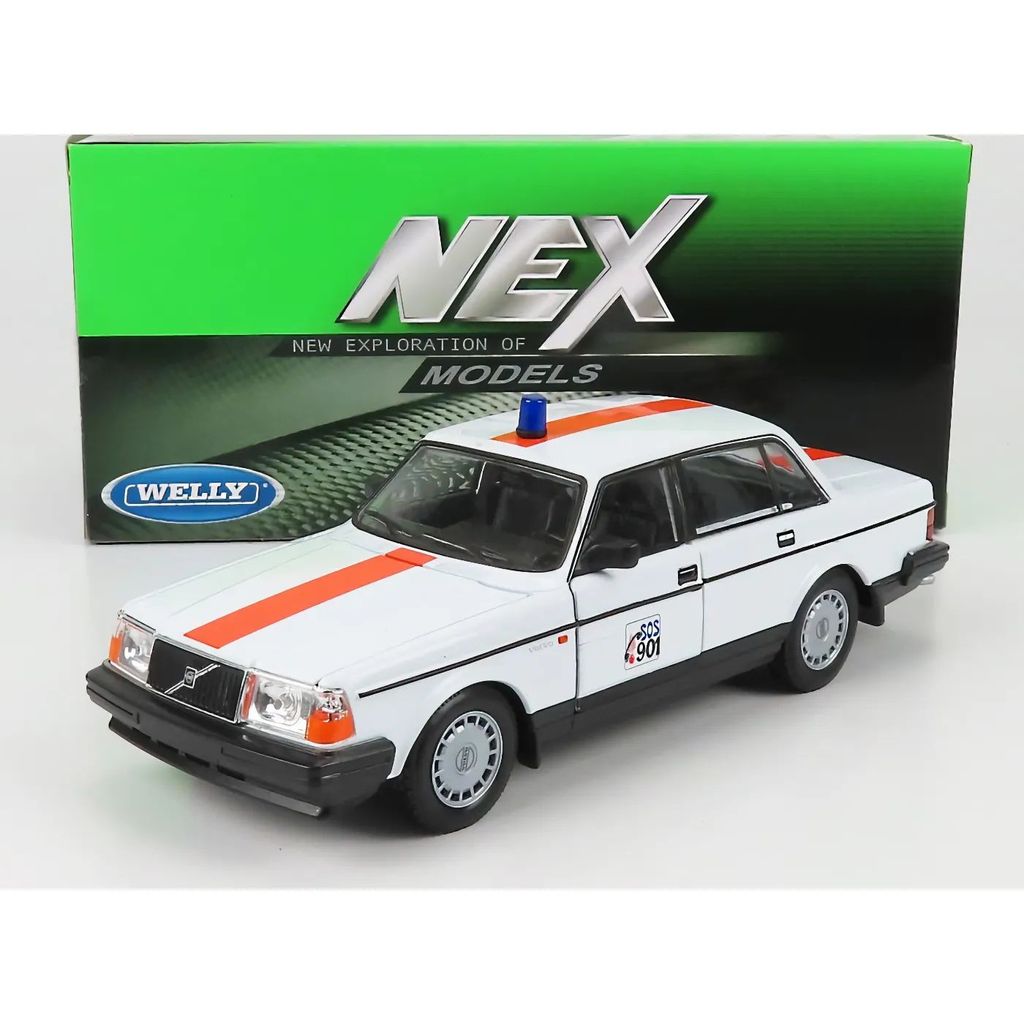 Belgisk politibil i form af en hvid (med orange striber) Volvo 240 GL modelår 1986. Modelbilen er fra producenten Welly og er i skala 1:24 (længde ca. 19 cm).