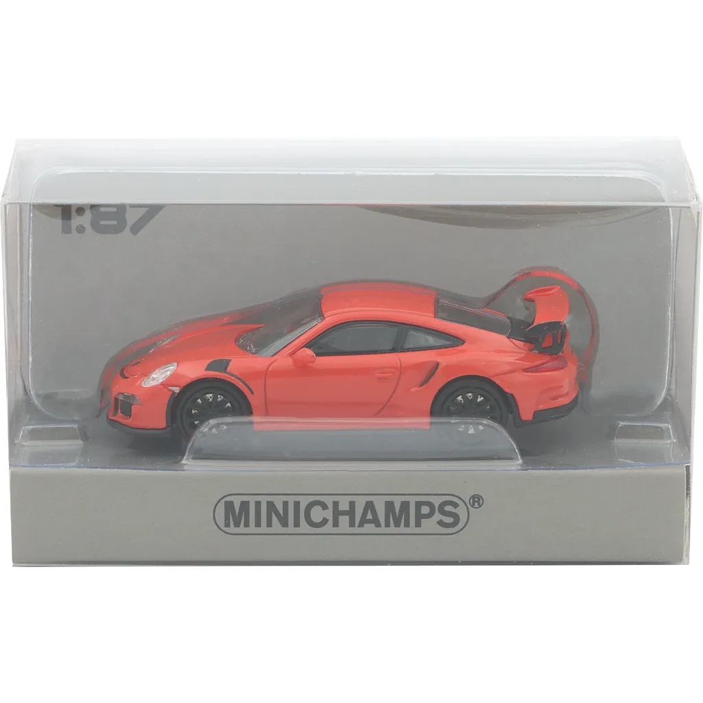 Orange Porsche 911 (991) GT3 RS, modelår 2015, som lille modelbil i skala 1:87 (5 cm). Porschen er fremstillet af tyske Minichamps og er en modelbil til voksne (14+) samlere.