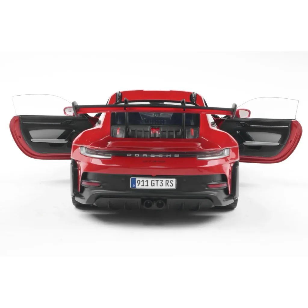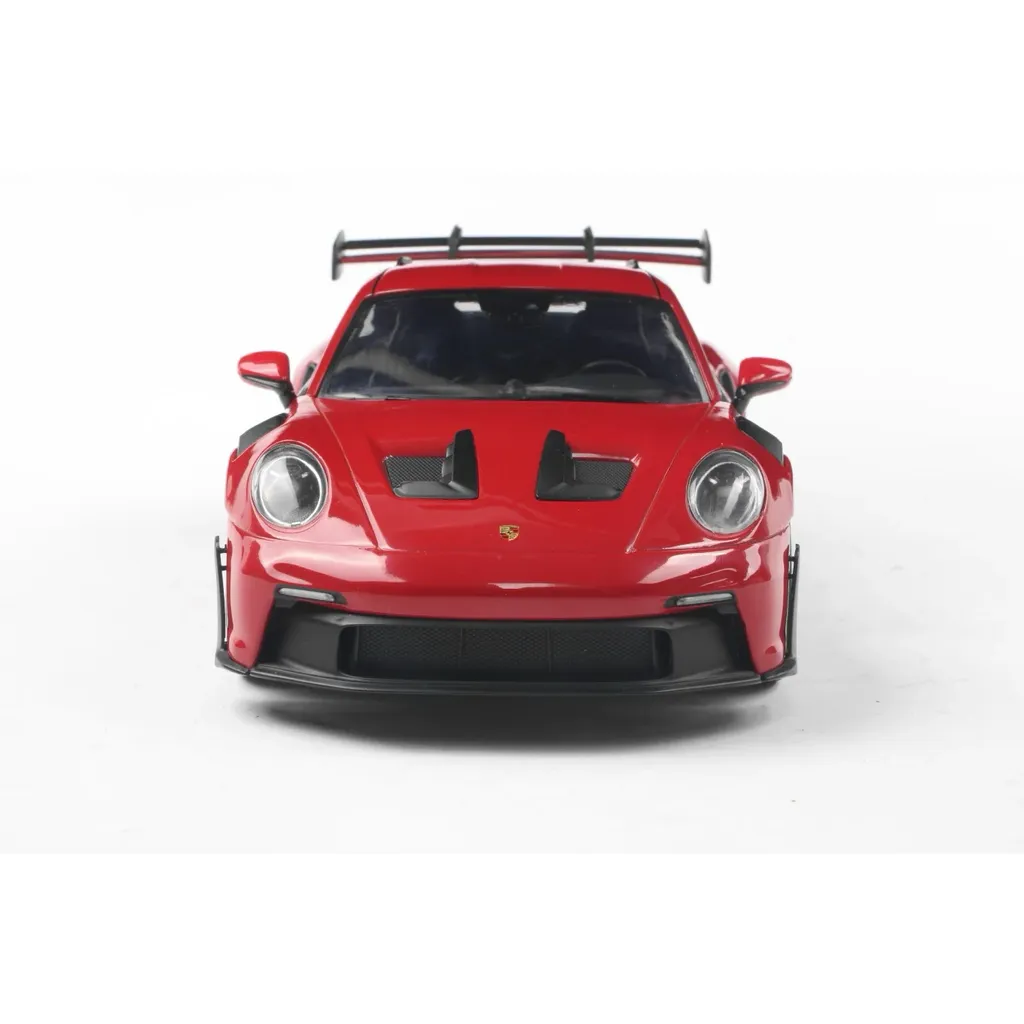 Porsche 911 (992) GT3 RS i skala 1:18 (26 cm) med døre, der kan åbnes, fra Solido. Porschen er rød med sorte detaljer og sort stribe og teksten "GT3 RS".