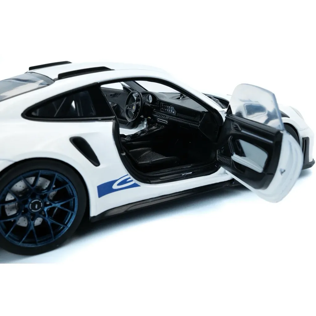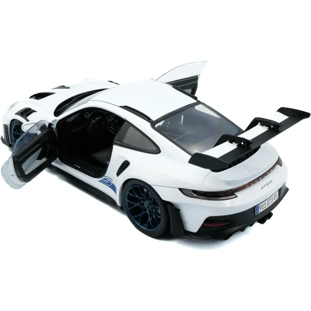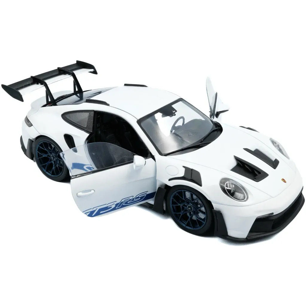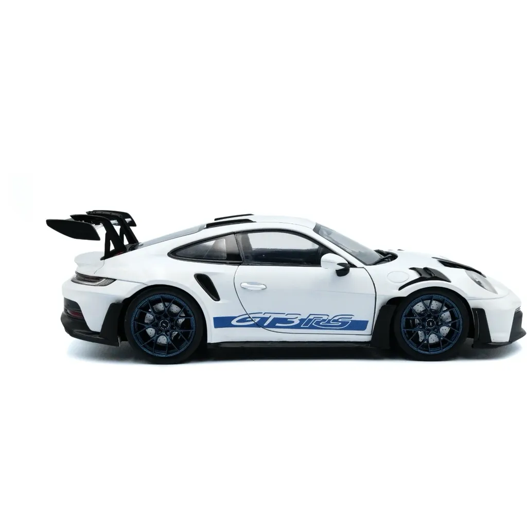 Porsche 911 (992) GT3 RS i skala 1:18 (26 cm) med døre, der kan åbnes, fra Solido. Porschen er hvid med sorte detaljer og blå stribe og teksten "GT3 RS".