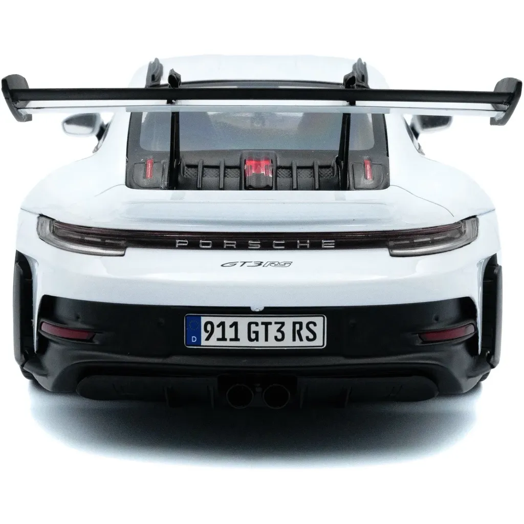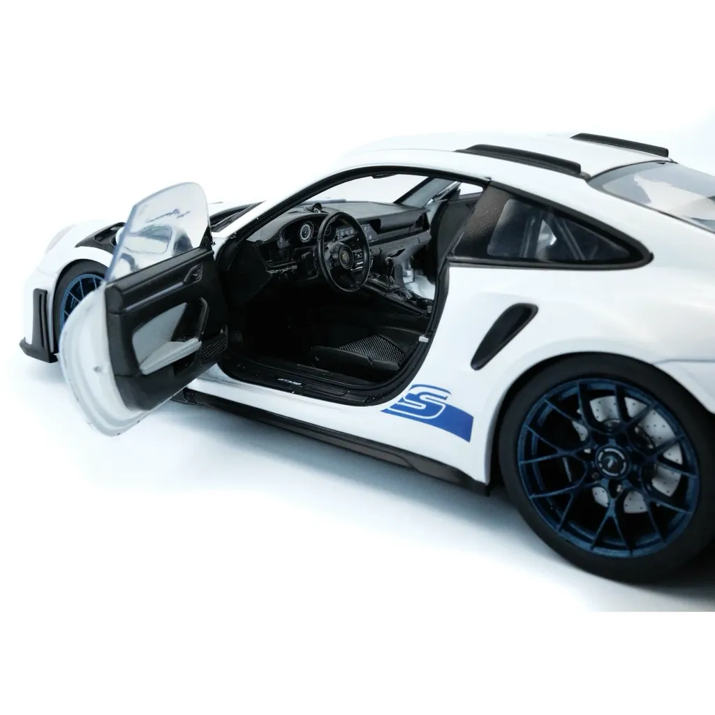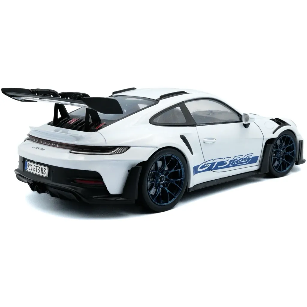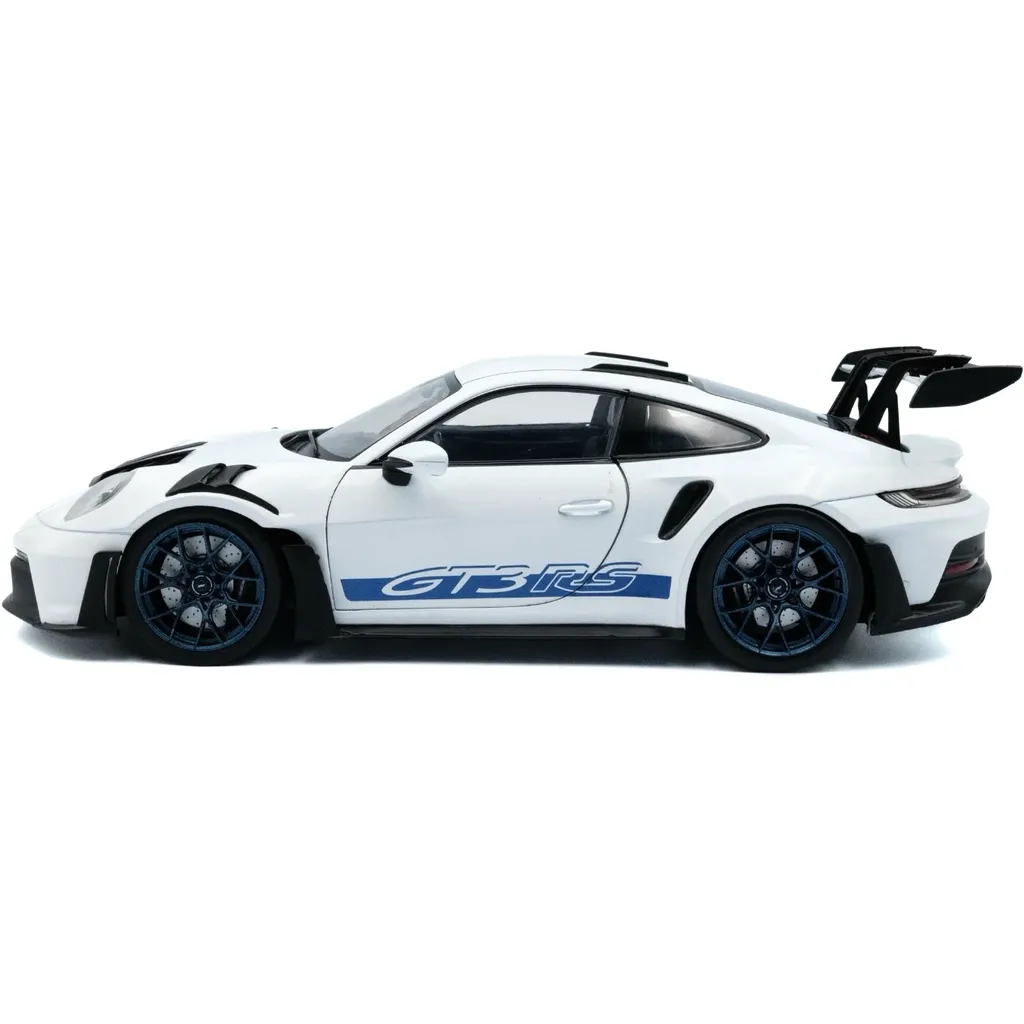 Porsche 911 (992) GT3 RS i skala 1:18 (26 cm) med døre, der kan åbnes, fra Solido. Porschen er hvid med sorte detaljer og blå stribe og teksten "GT3 RS".