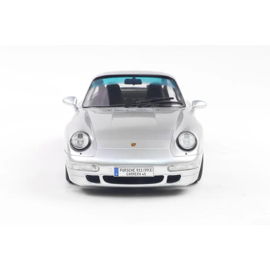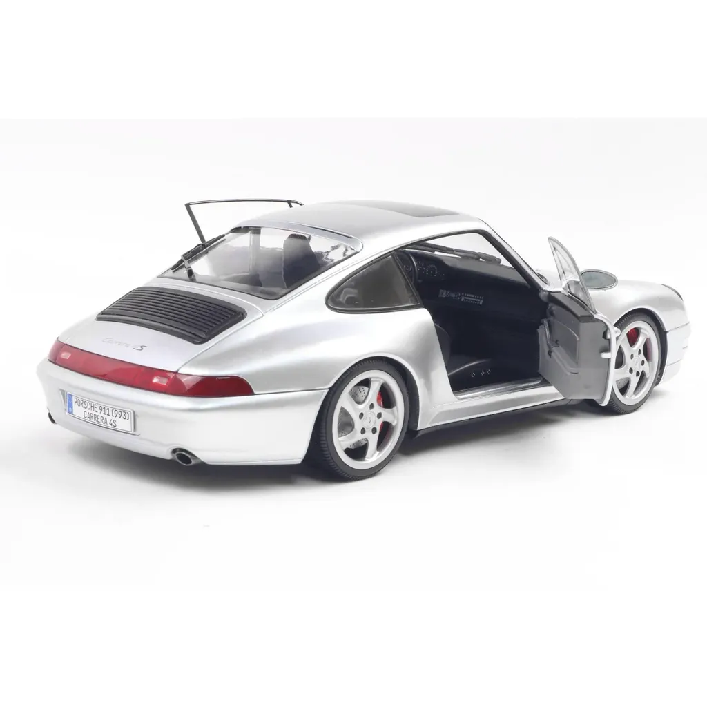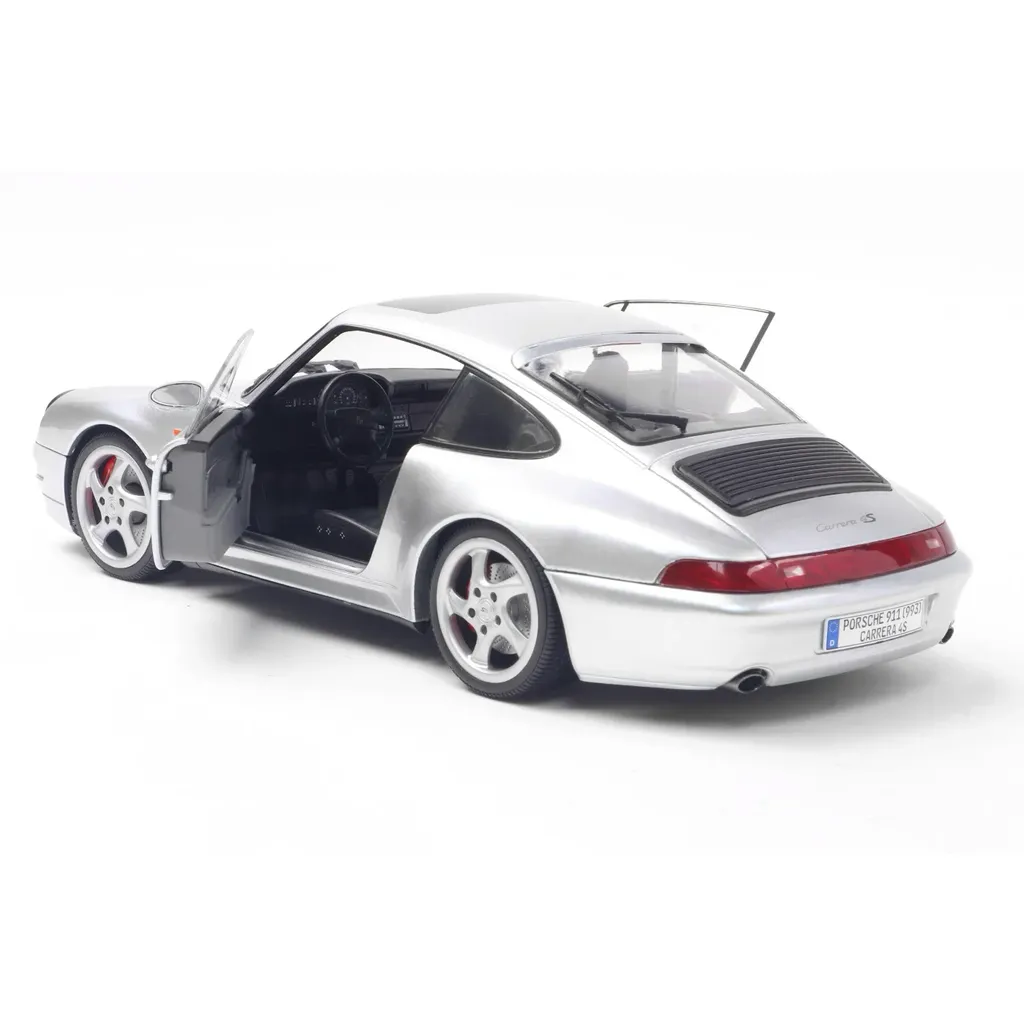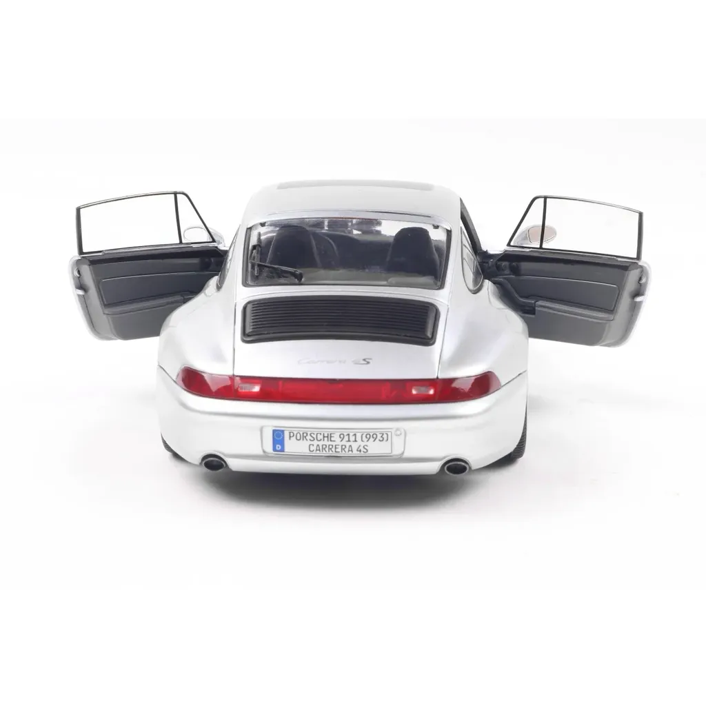 Porsche 911 (993) 4S i skala 1:18 (24 cm) med døre, der kan åbnes, fra Solido. Porschen er i farven Polar Silver, og modelåret er 1996.