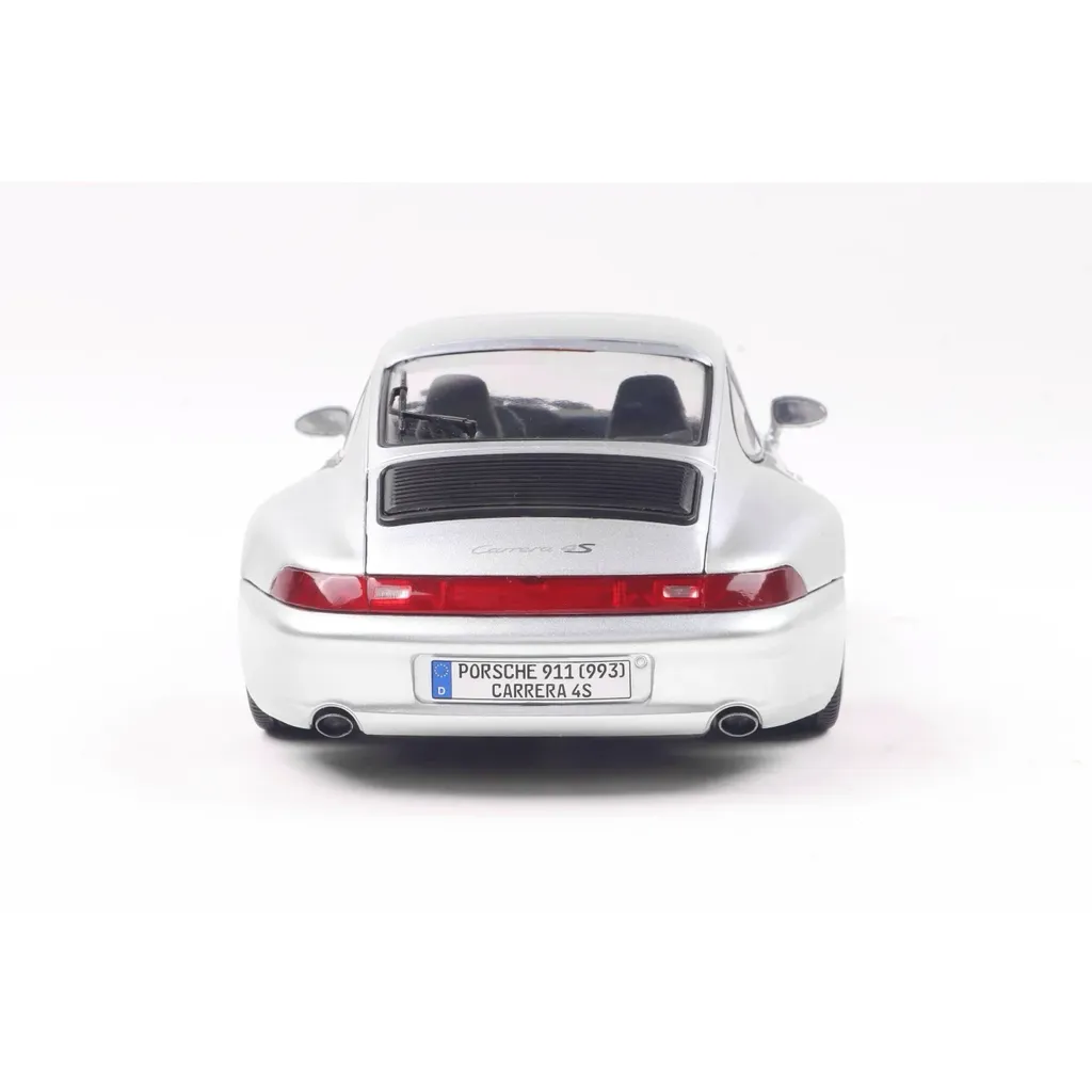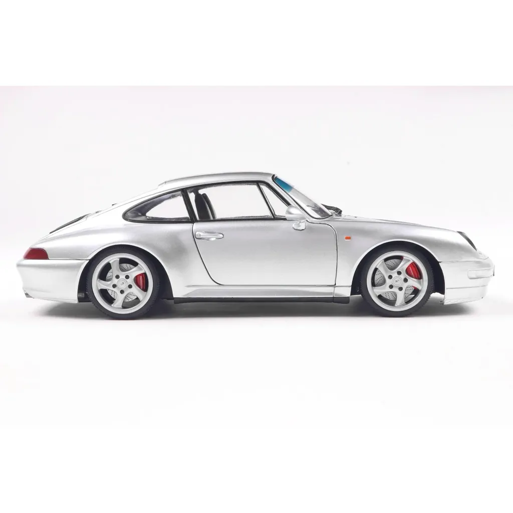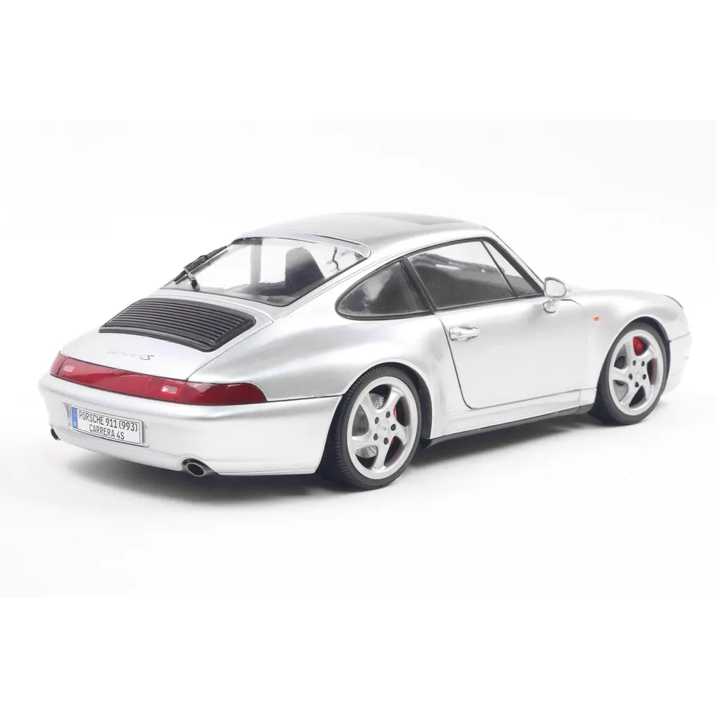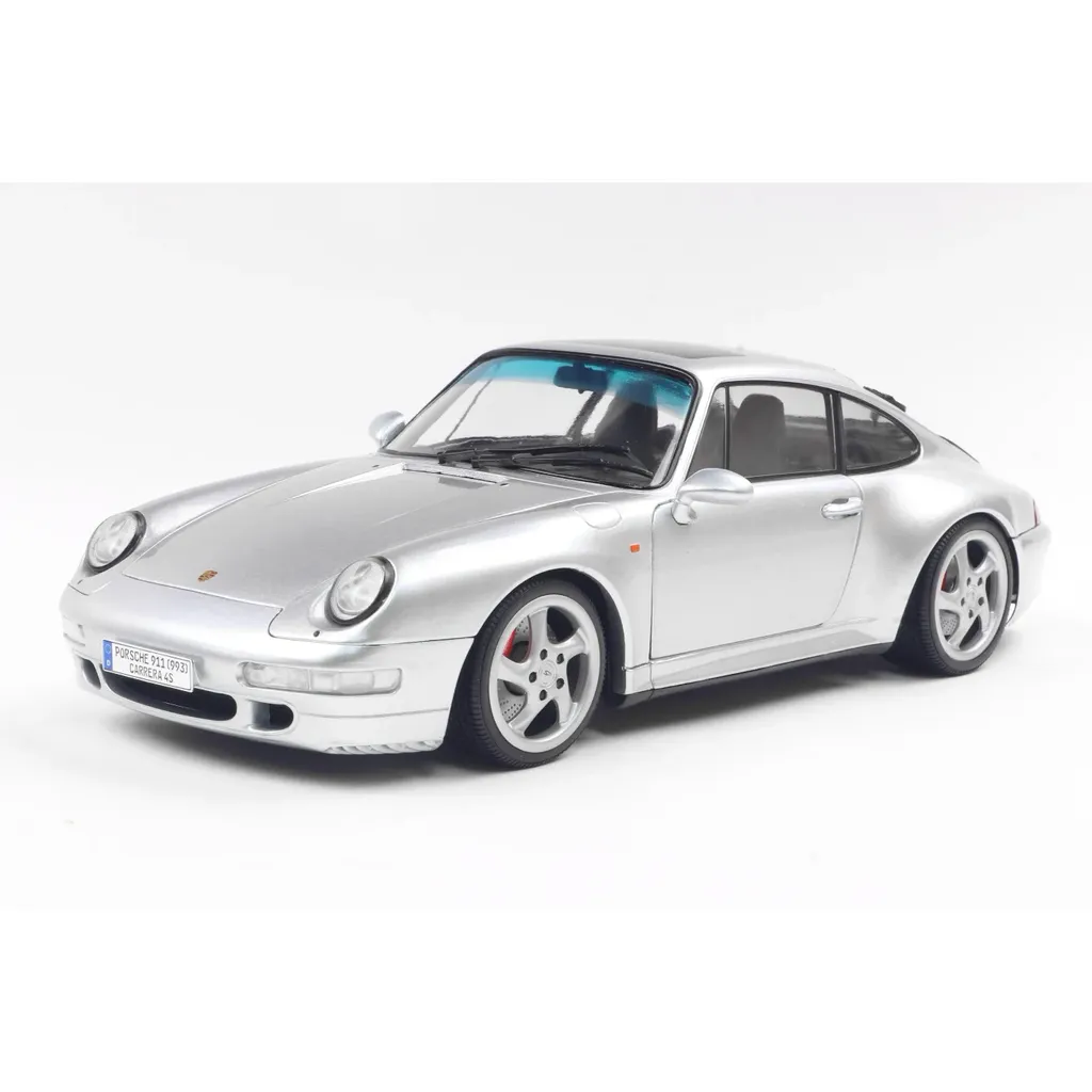 Porsche 911 (993) 4S i skala 1:18 (24 cm) med døre, der kan åbnes, fra Solido. Porschen er i farven Polar Silver, og modelåret er 1996.