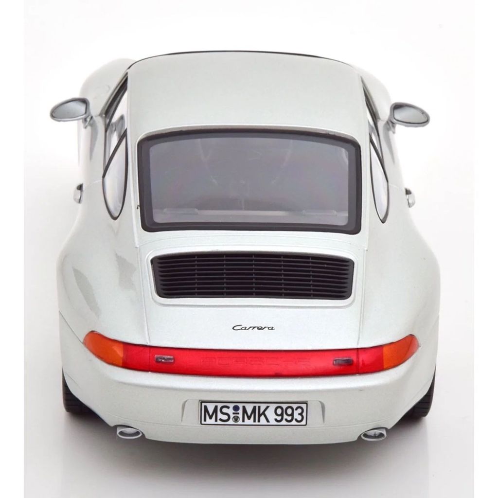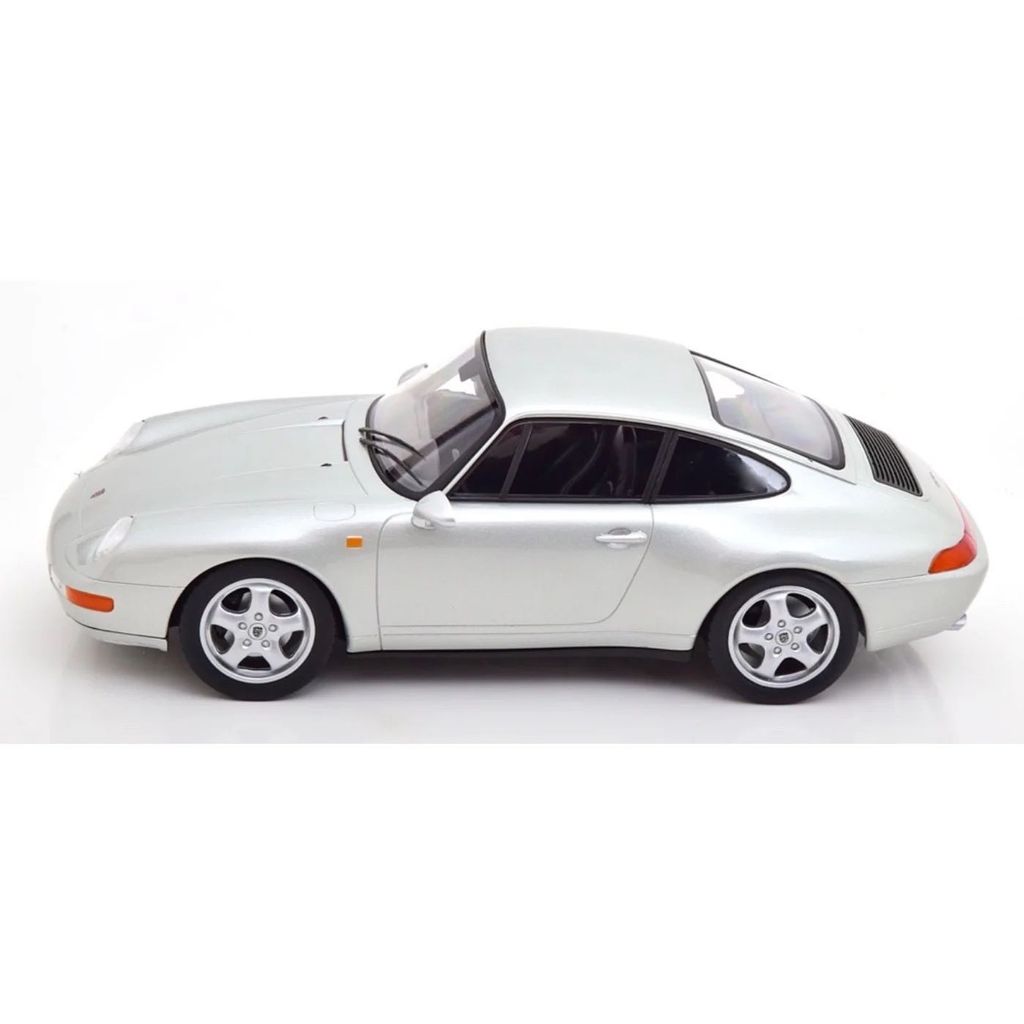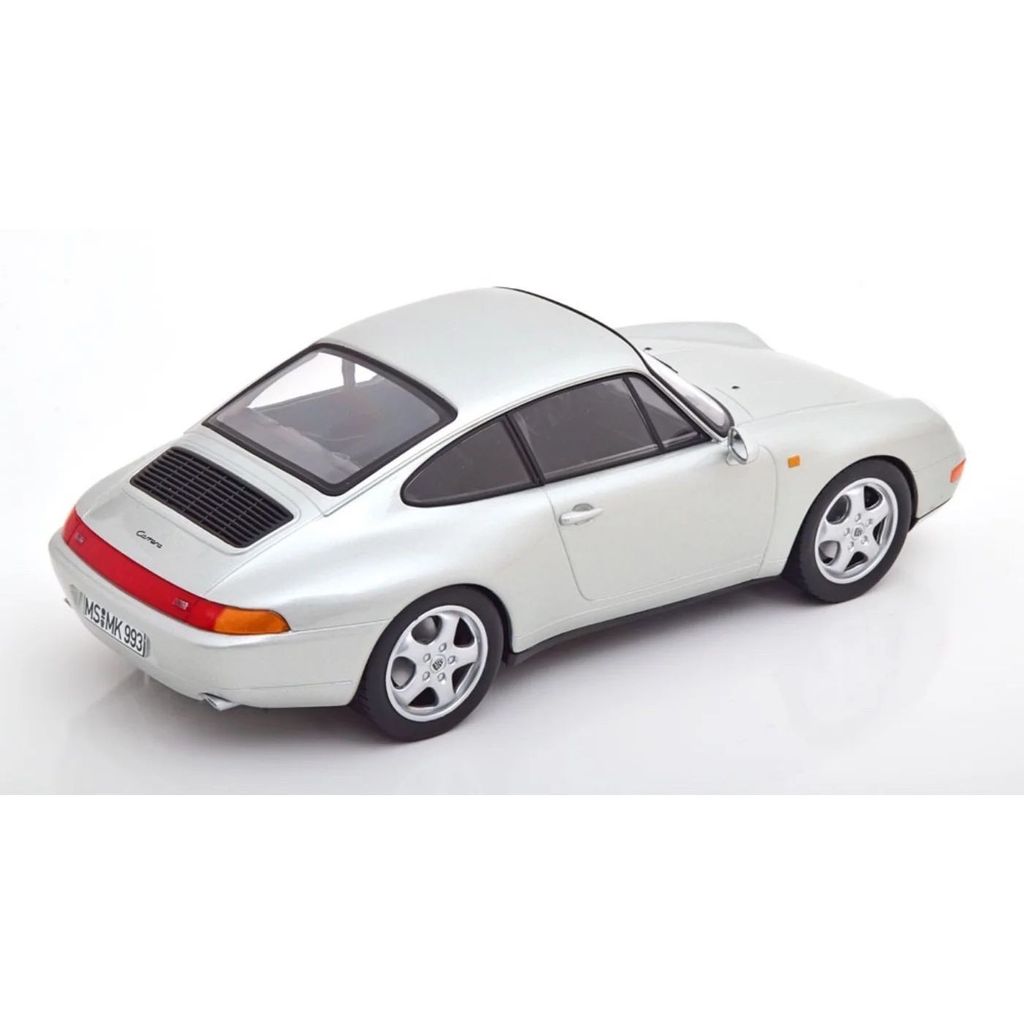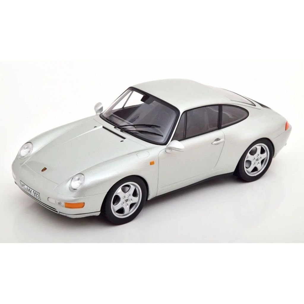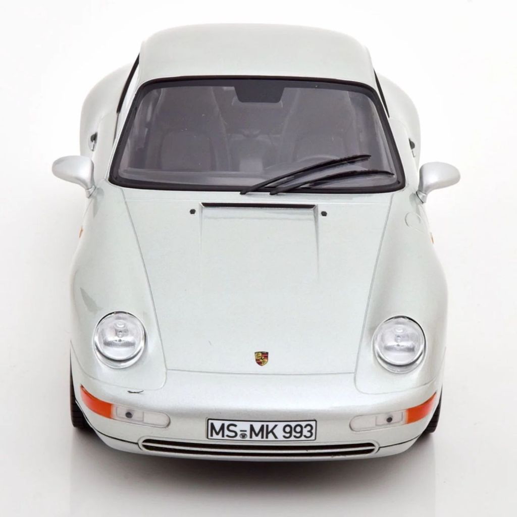 Porsche 911 (993) Carrera, modelår 1993, i sølv fra Norev. Skalaen er 1:18, hvilket betyder en længde på ca. 23 cm.