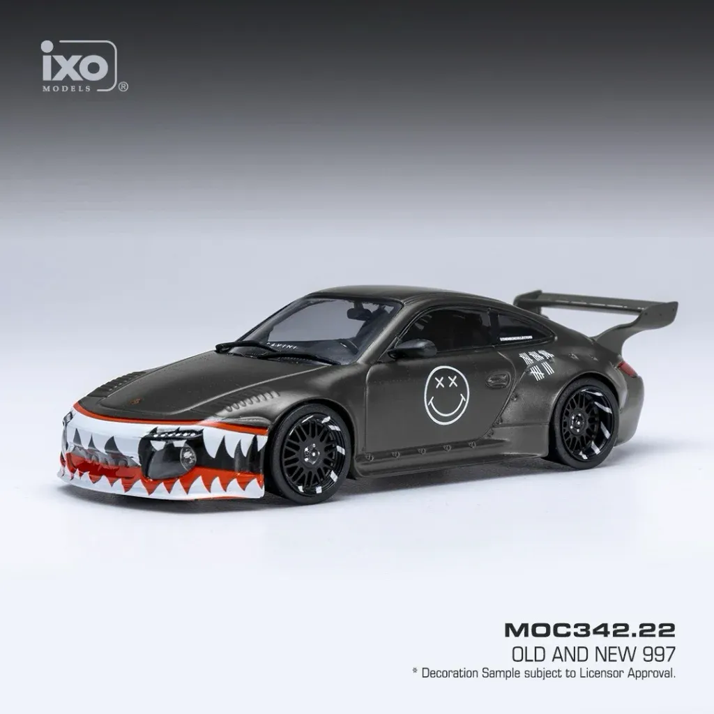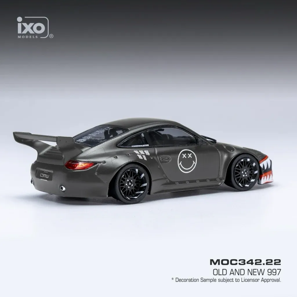 Sort Porsche 911 (997) med bodykit fra japanske Old & New. Porschen er en model lavet af Ixo Models i skala 1:43 (10,5 cm).