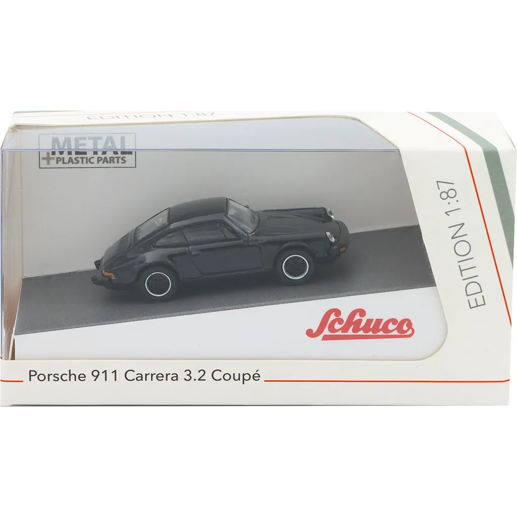 En sort Porsche 911 Carrera 3.2 Coupé, modelår 1989, fra producenten Schuco i skala 1:87 (4,5 cm).