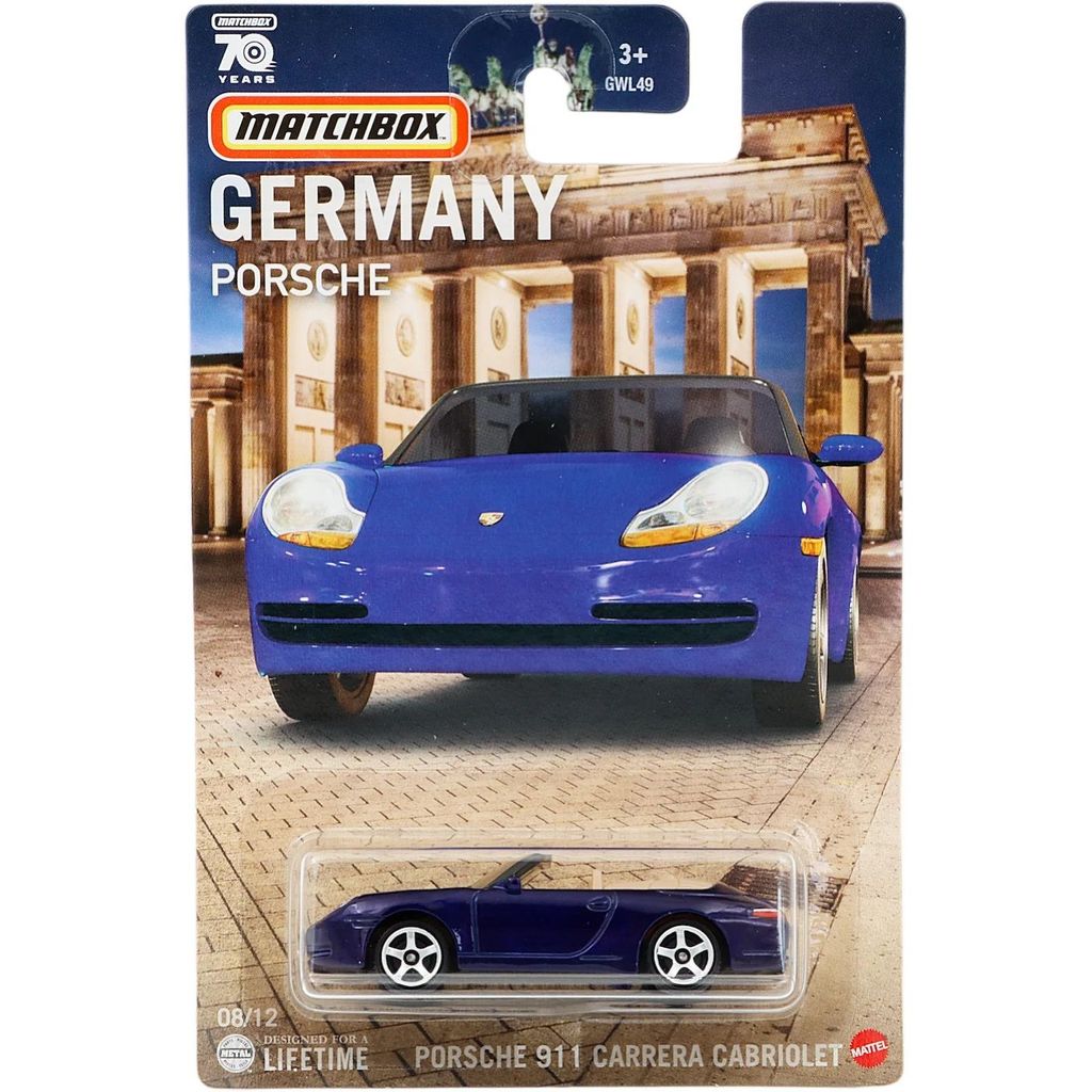 Porsche 911 Carrera Cabriolet i blå fra Matchbox og serien Tyskland fra 2023, hvor denne Carrera er bil 8 ud af 12.