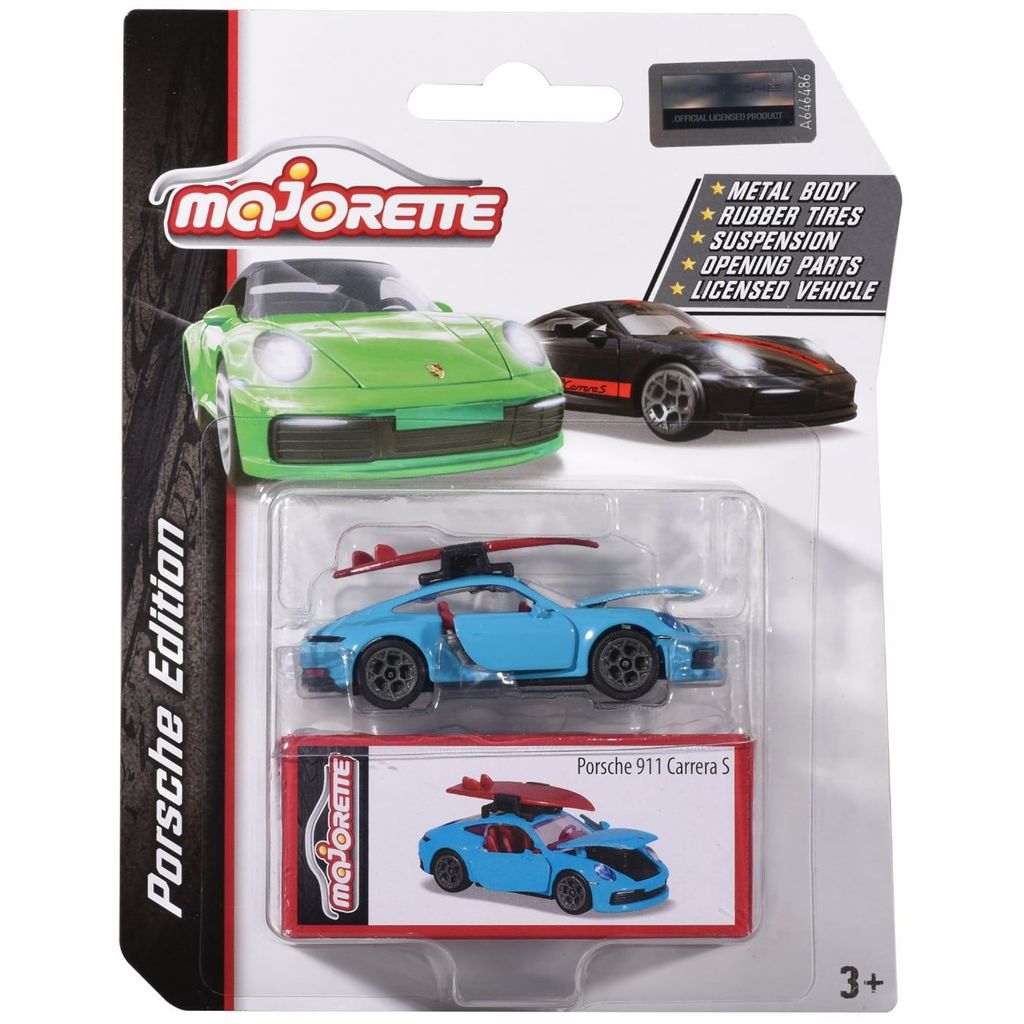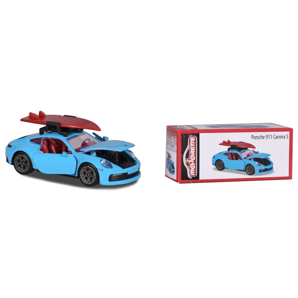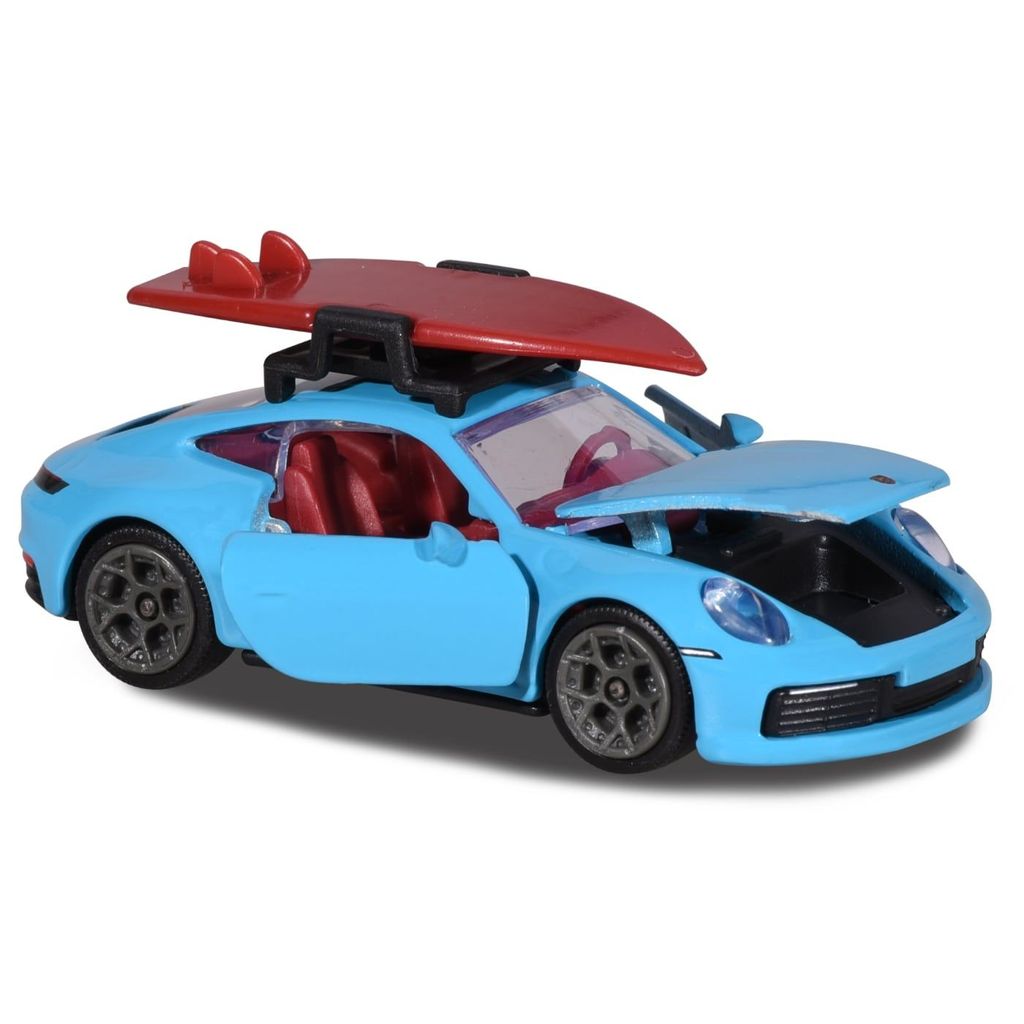 Turkis Porsche 911 Carrera S med surfbræt på taget fra Majorette i skala 1:60, ca. 7,5 cm lang.