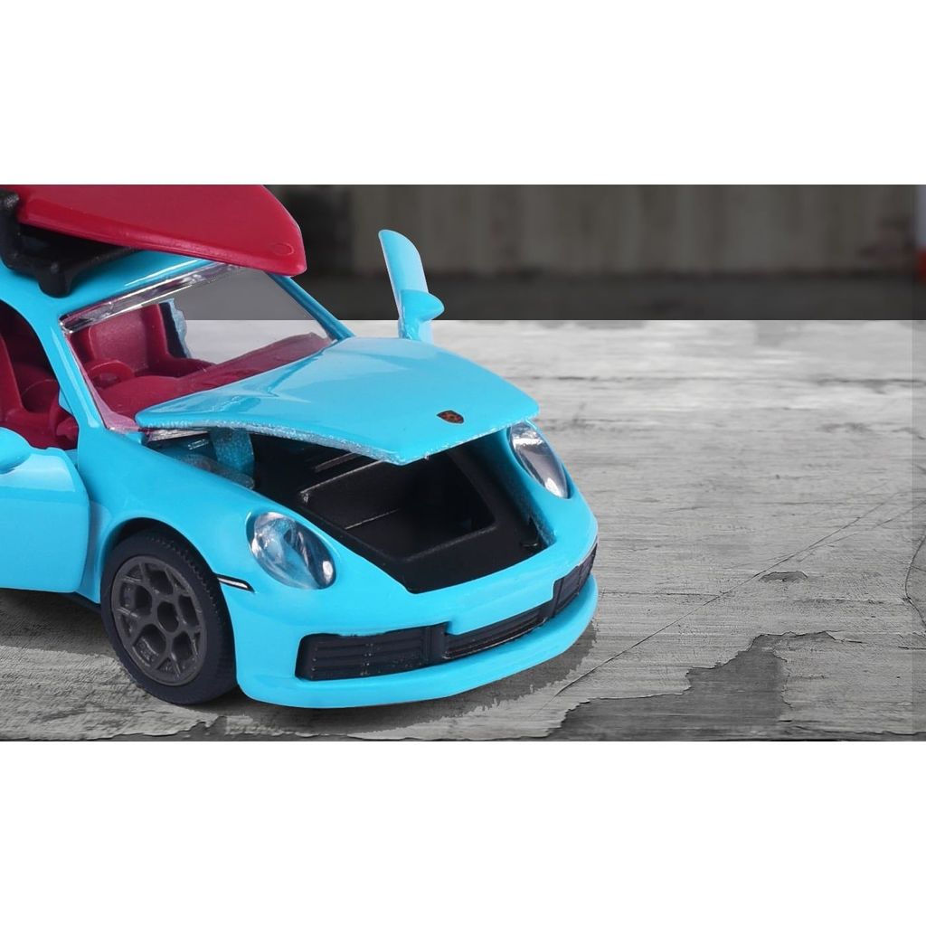 Lækker turkis Porsche 911 Carrera S fra Majorette i skala 1:60, ca. 7,5 cm lang. Bilen kommer pakket sammen med en lille papkasse/samlekasse, som kan bruges til opbevaring, hvis det ønskes.
