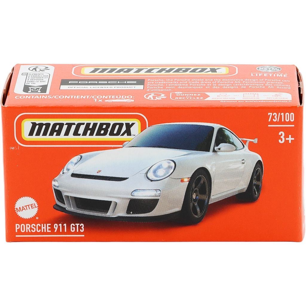 Hvid Porsche 911 GT3 fra Matchbox og Power Grab-serien, hvor denne legetøjsbil er bil nummer 73/100.