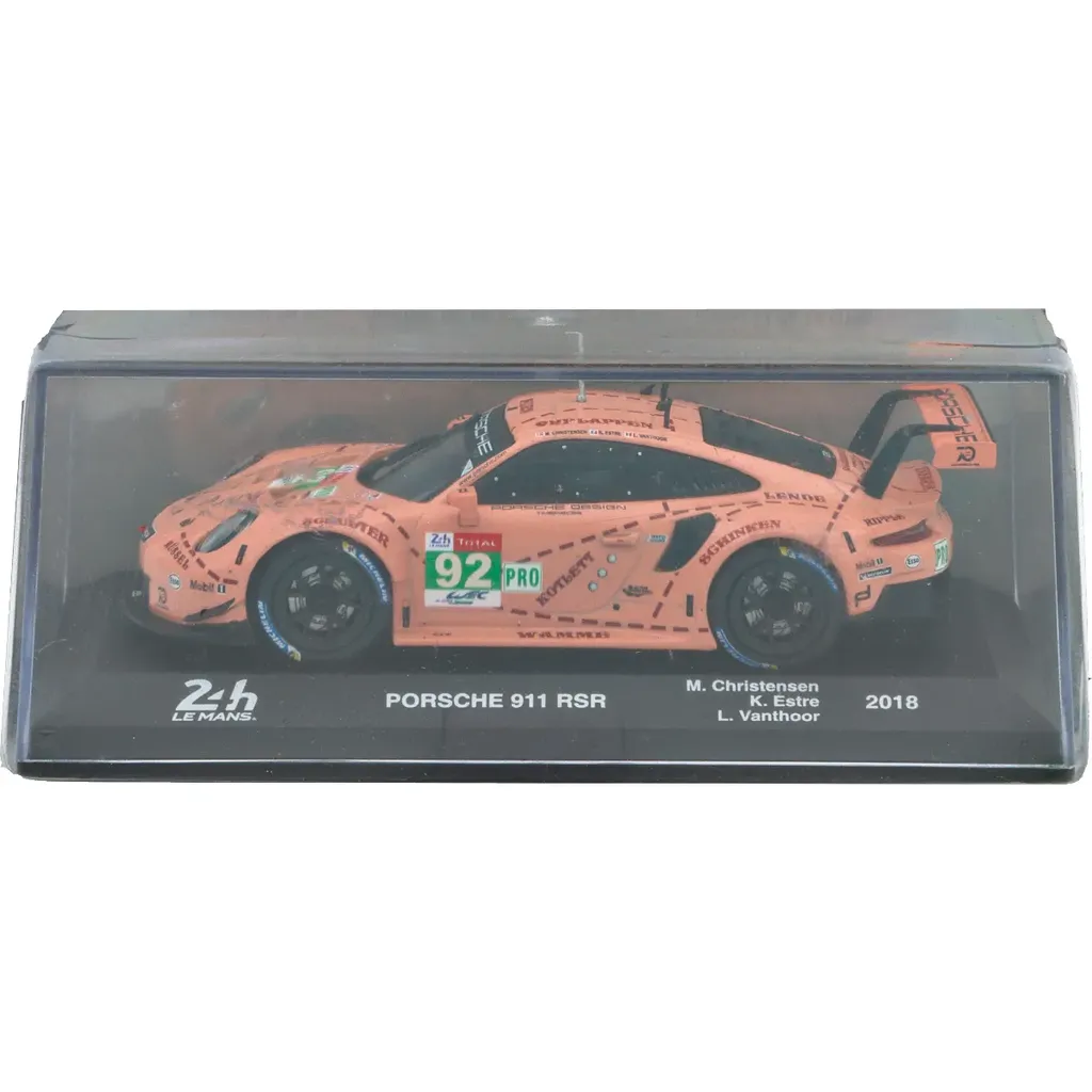 Pink Porsche 911 RSR, der deltog i 24h Le Mans 2018. Bilen blev kørt af Christensen, Estre og Vanthoor. Modelbilen er produceret af Altaya i samarbejde med Spark i skala 1:43 (11 cm).
