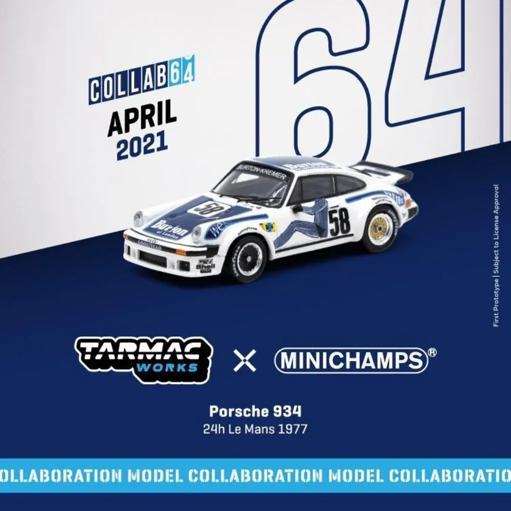Porsche 934 fra Tarmac Works og COLLAB64-serien, hvor Tarmac Works har samarbejdet med Minichamps om produktionen af denne Porsche 934. Skalaen er 1:64 (6,5 cm).
