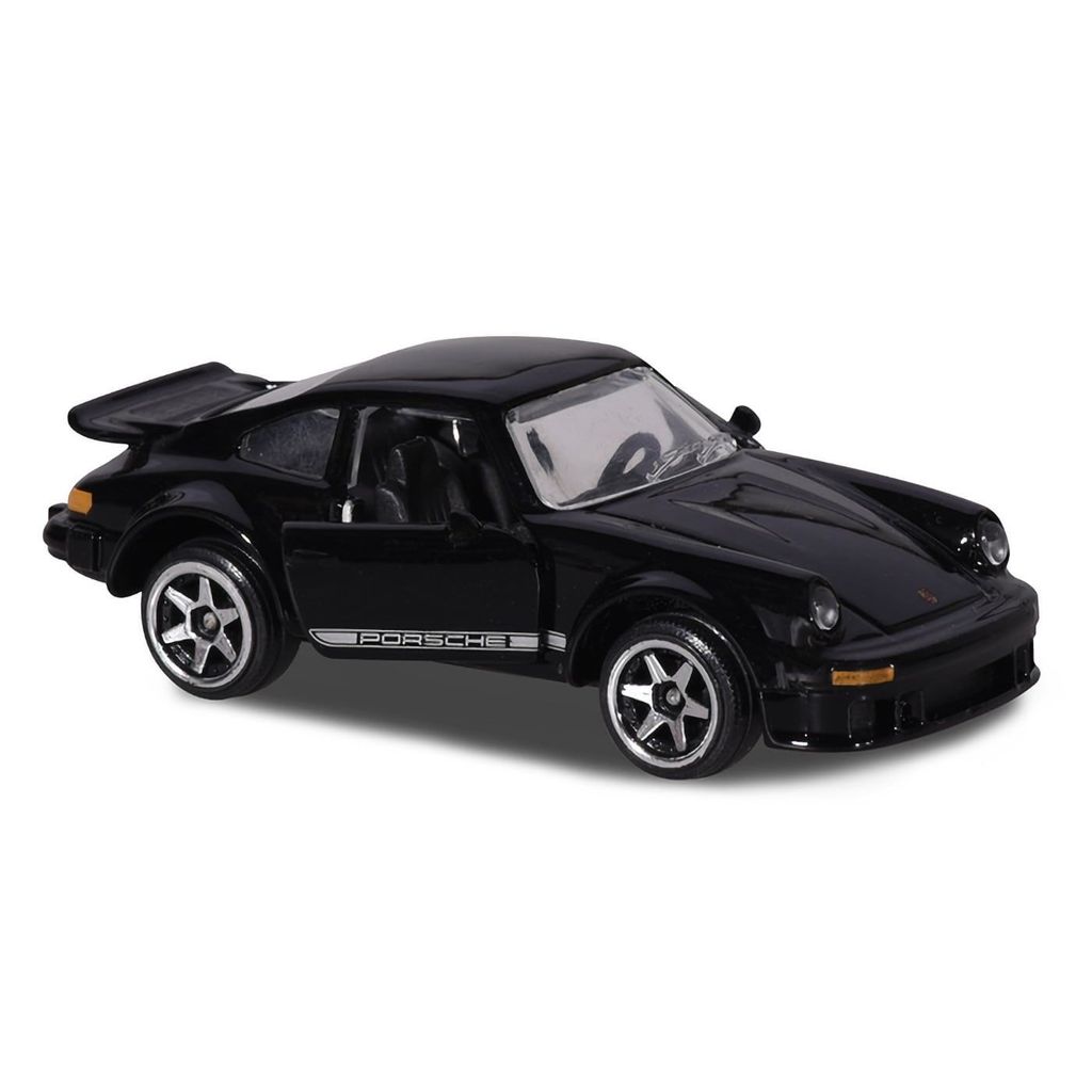 Sort Porsche 934 i skala 1:57 fra Majorette og Vintage-serien. Bilen har døre, der kan åbnes.