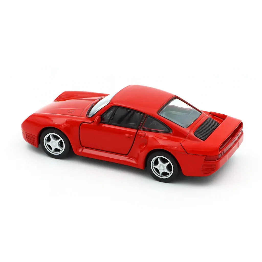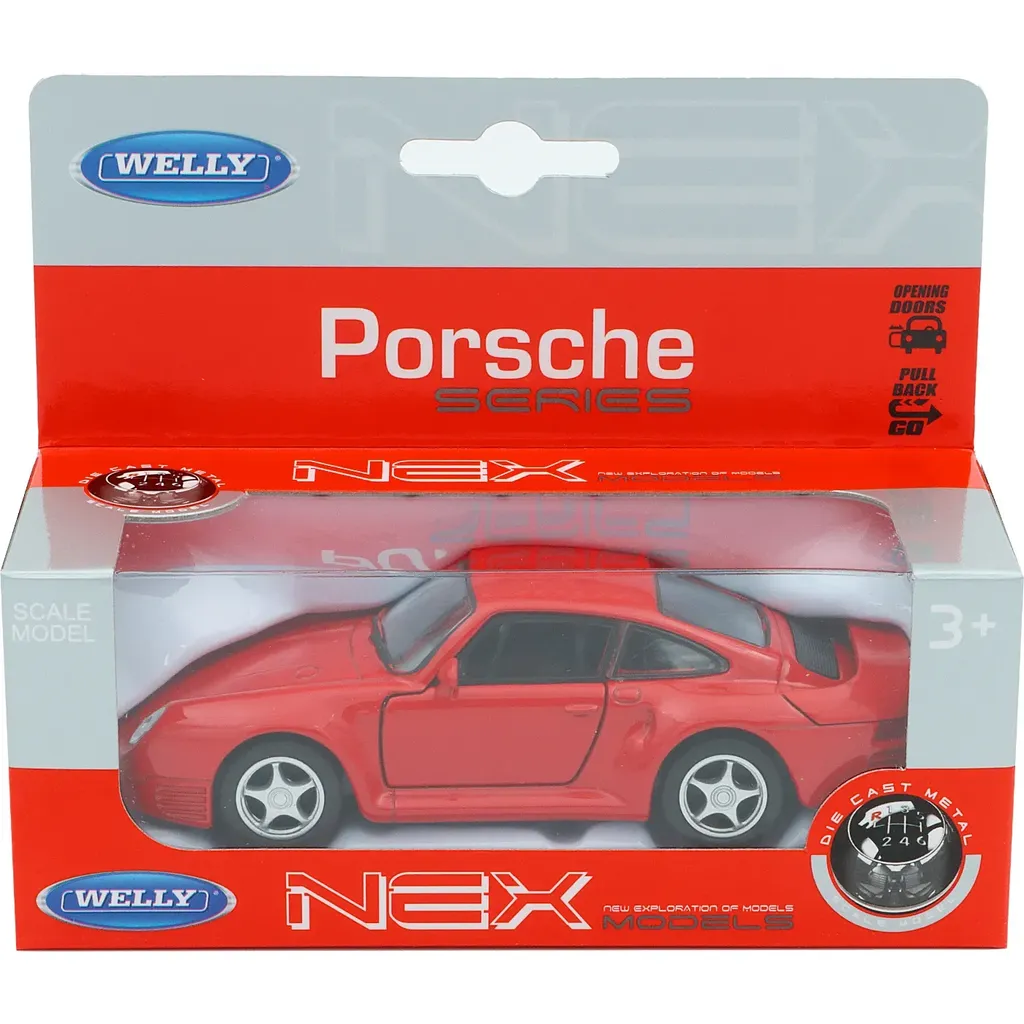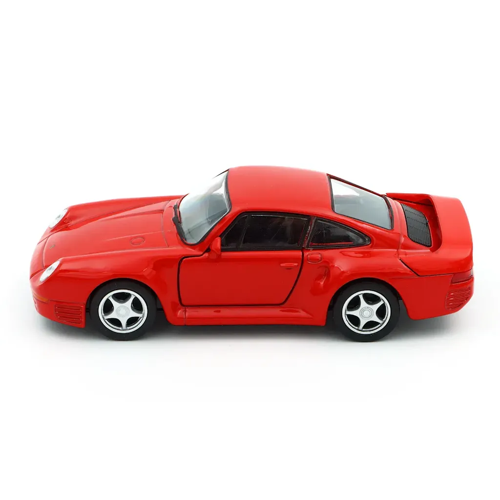 Porsche 959 i rød fra Welly. Dørene kan åbnes. Bilen er 11,5 cm (målestok ca. 1:34-1:39).