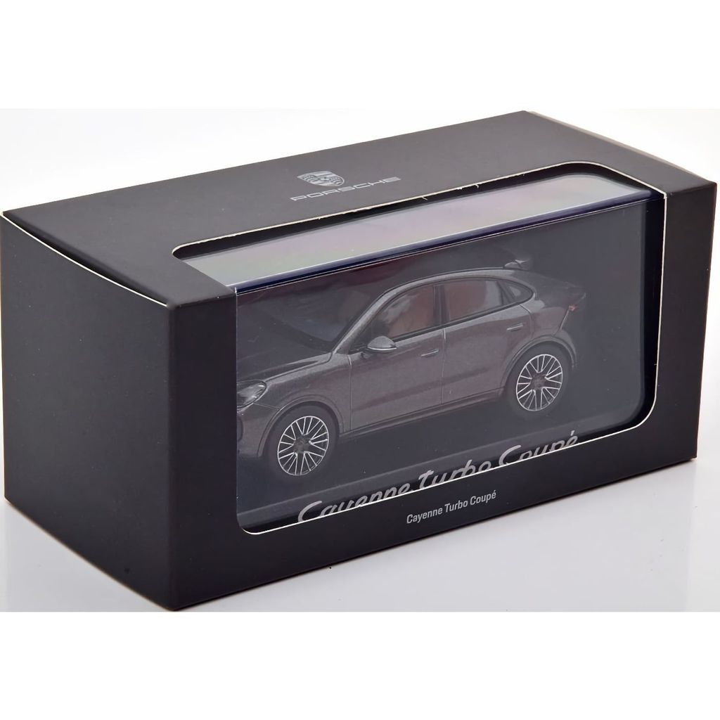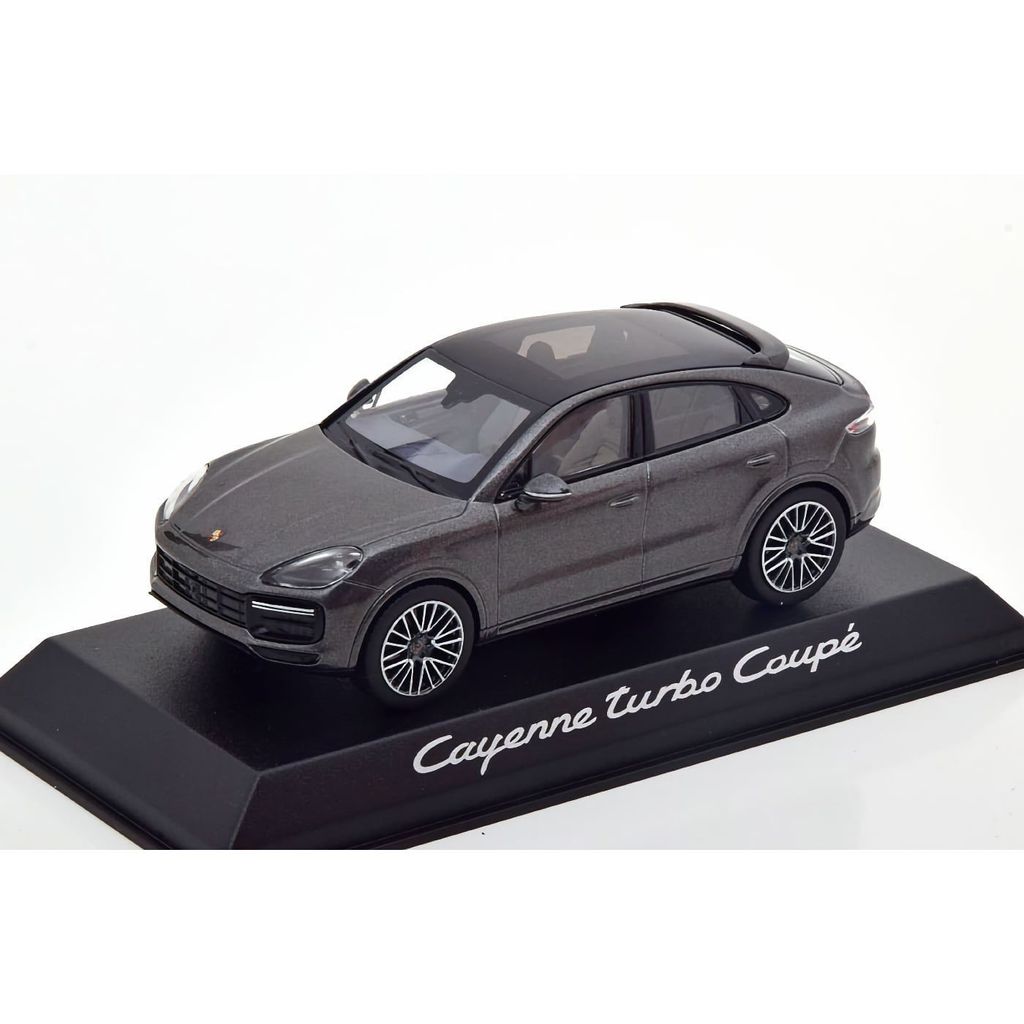 Modelbil i form af en grå Porsche Cayenne Turbo Coupé modelår 2019 i skala 1:43. Modellen er produceret af Norev.