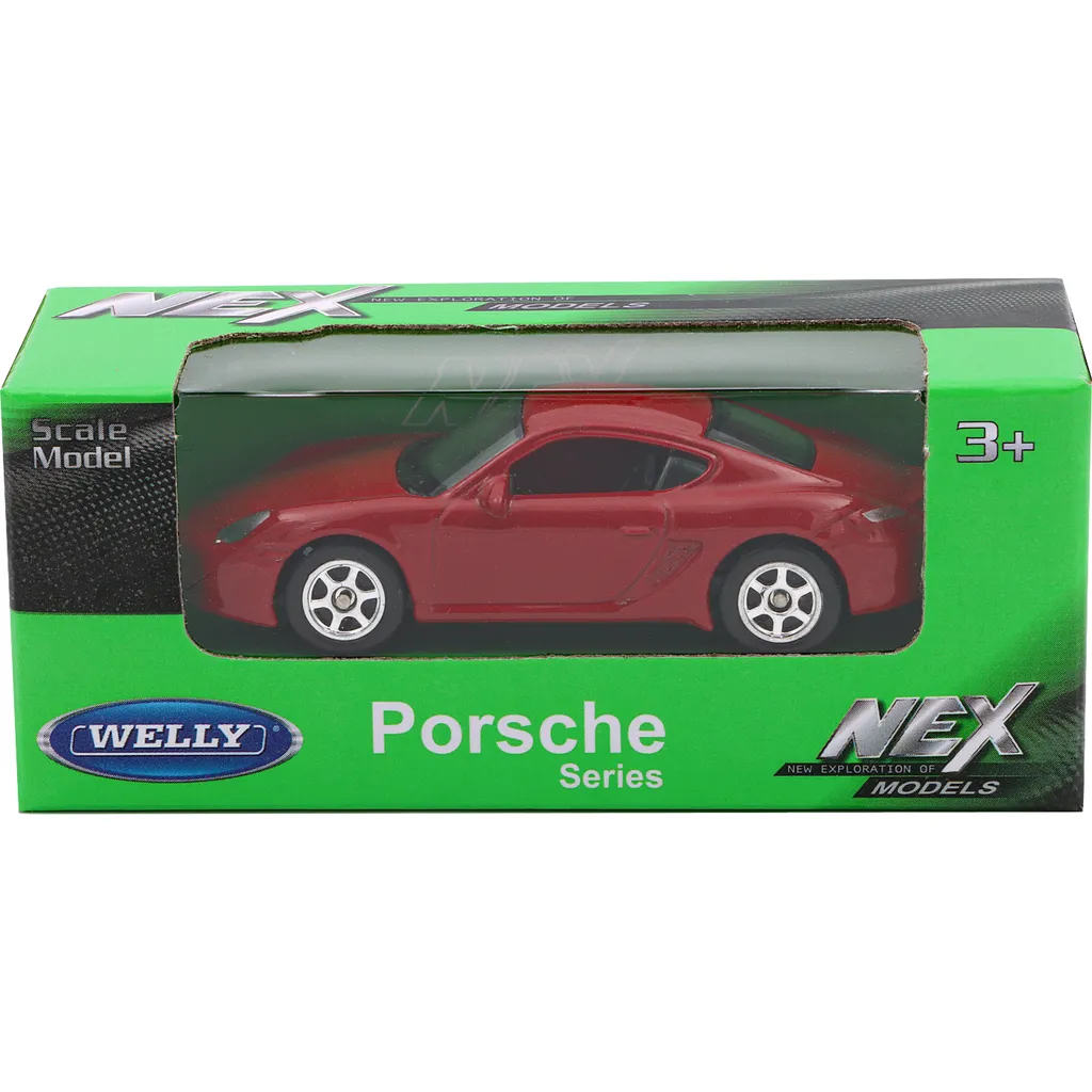Rød Porsche Cayman S som en lille (7 cm / skala 1:64) legetøjsbil fra Welly og deres Porsche-serie.