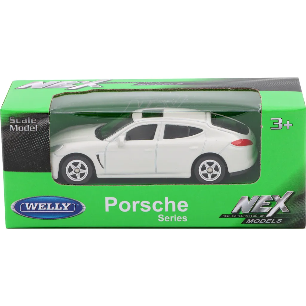 Hvid Porsche Panamera S som en lille (7 cm / skala 1:64) legetøjsbil fra Welly og deres Porsche-serie.