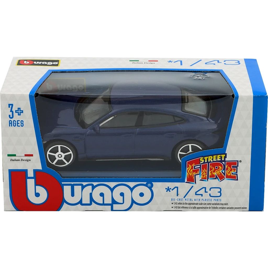 Blå Porsche Taycan Turbo S, modelår 2019, som legetøjsbil fra Bburago. Bilen er 11 cm lang, skala 1:43.