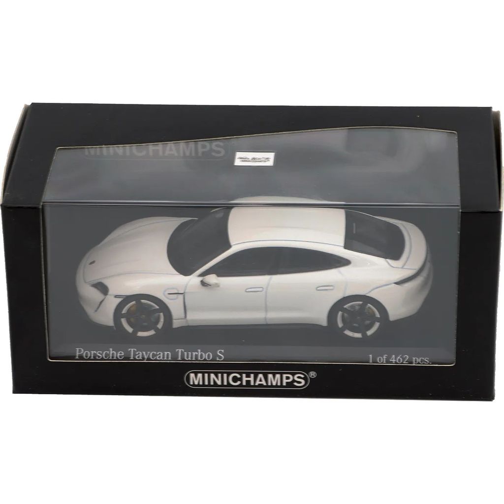Modellen leveres i en displayboks med en sort bundplade og hvid tekst, der lyder "Porsche Taycan Turbo S - Carraraweiß metallic - 1 af 462 stk.". Sidstnævnte betyder, at dette er en meget begrænset model, der er produceret i 462 eksemplarer.