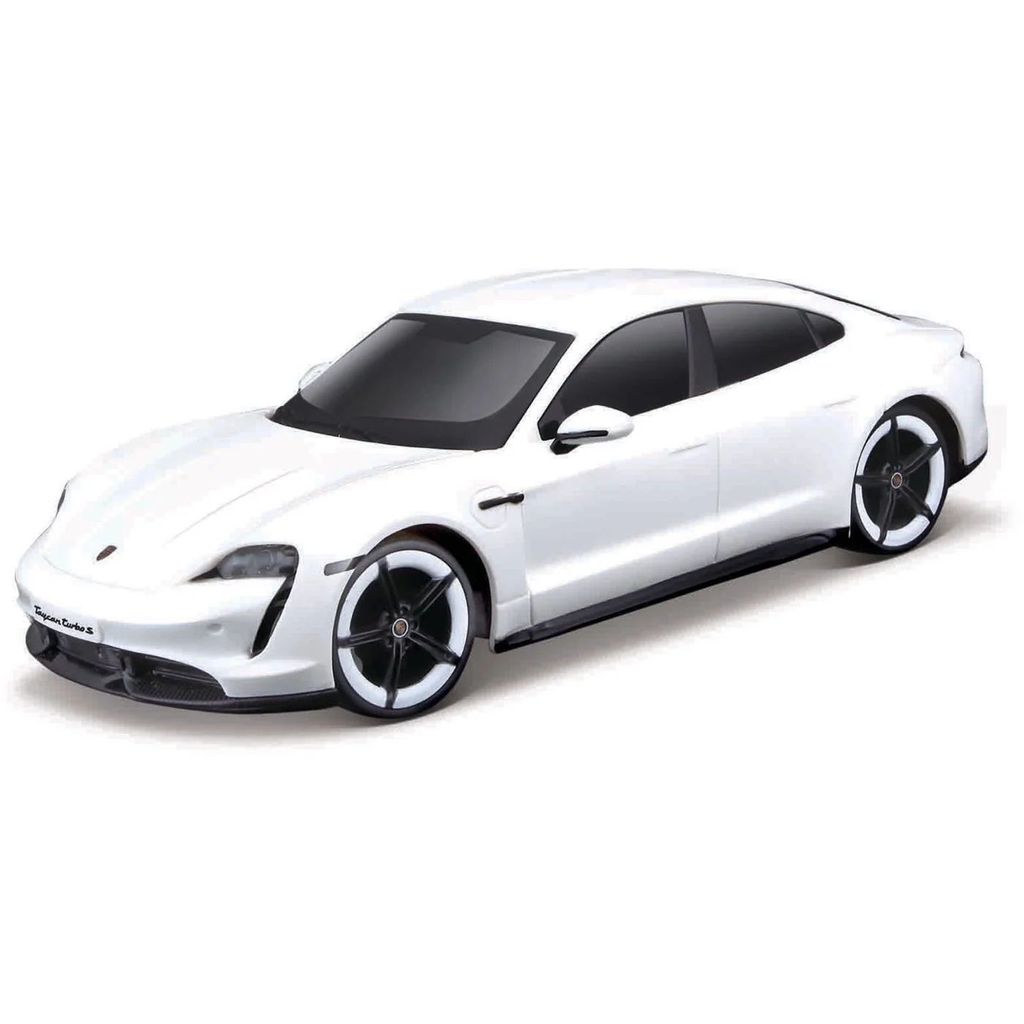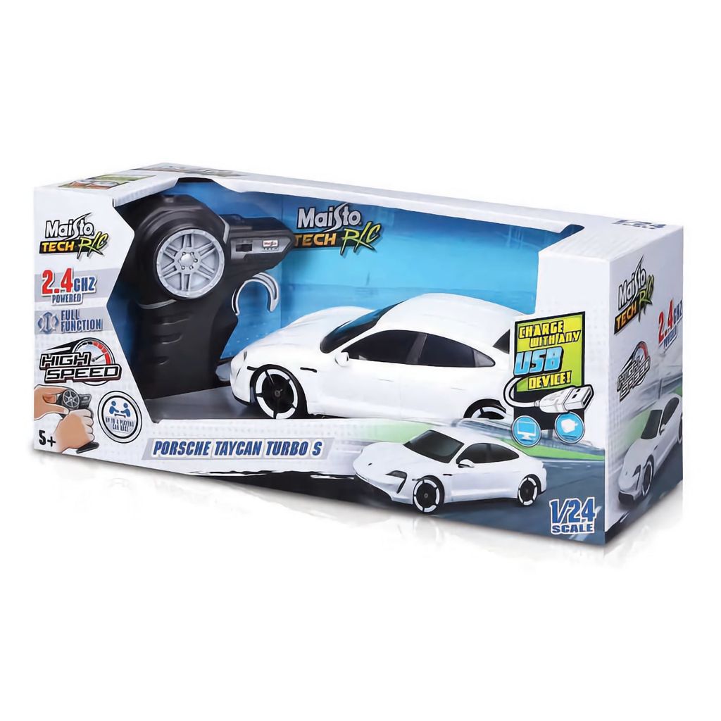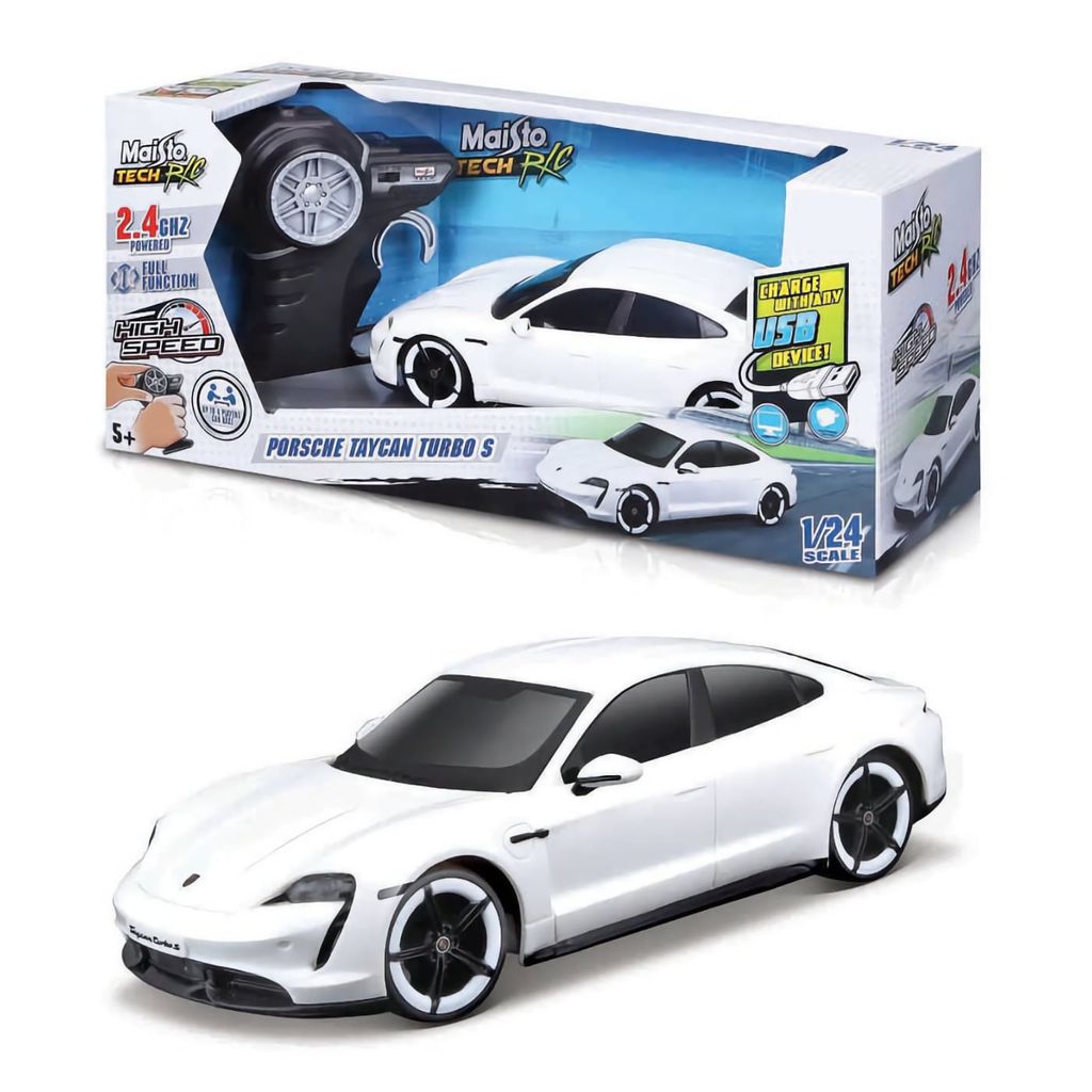 Radiostyret Porsche Taycan Turbo S fra Maisto i skala 1:24 (20 cm lang). Den radiostyrede bil er en del af Ministos "Tech R/C"-serie.