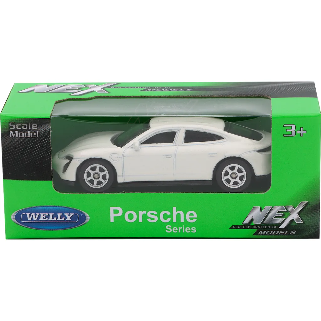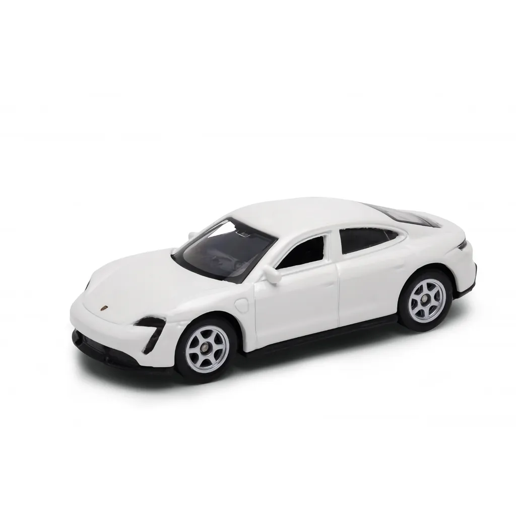 Hvid Porsche Turbo Taycan S som en lille (7 cm / skala 1:64) legetøjsbil fra Welly og deres Porsche Series-sortiment.