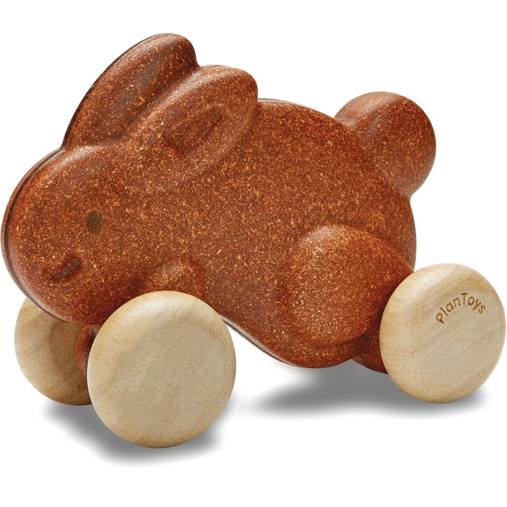 Push Along Bunny fra PlanToys er en brun trækanin fremstillet af PlanWood, som er PlanToys' eget materiale, der består af genanvendt savsmuld, giftfri lim og i dette tilfælde en brun, organisk maling.