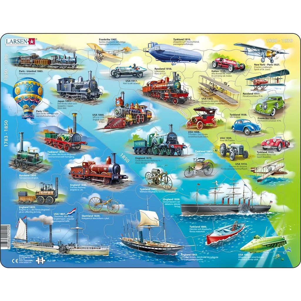 Et flot puslespil fra det norske mærke Larsen med historiske køretøjer. Puslespillet har 54 brikker og forestiller en række transportmidler fordelt på tre epoker (1783-1850, 1850-1900 og 1900-1939).
