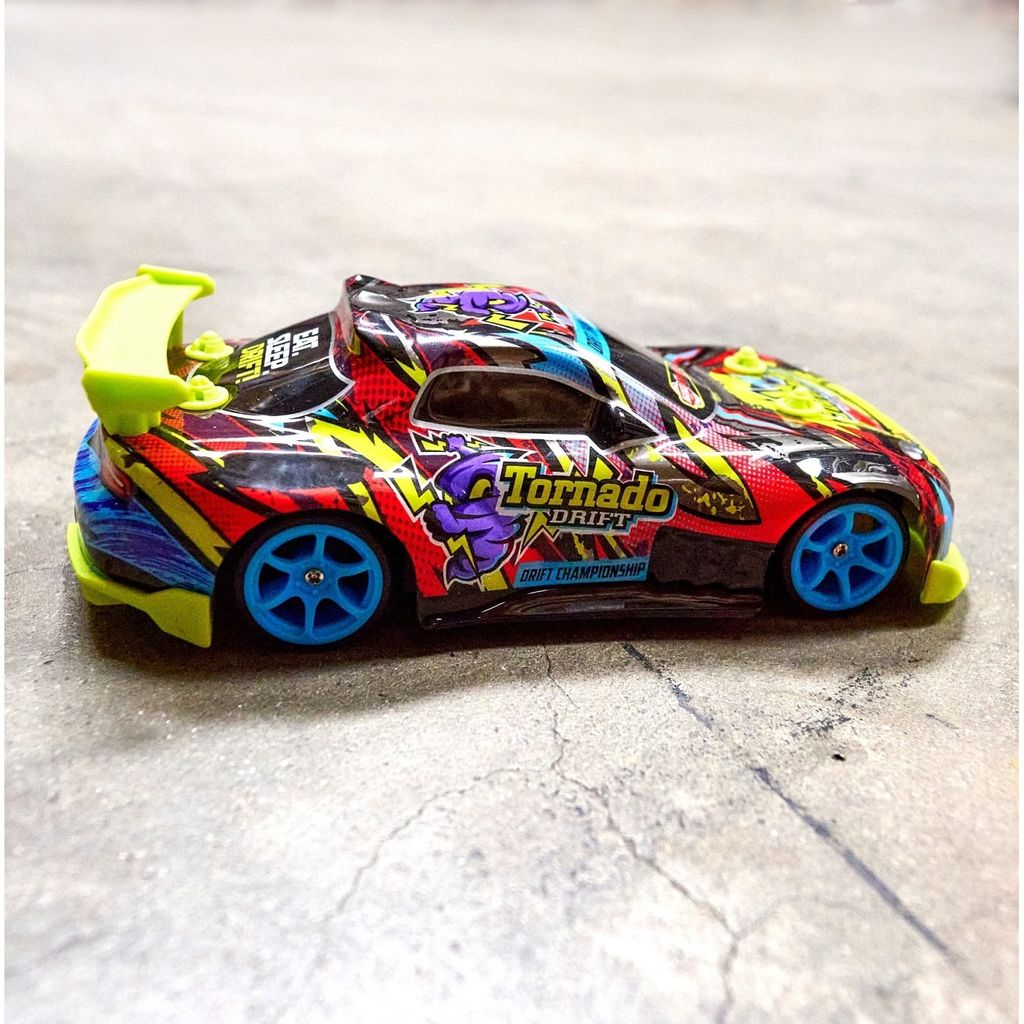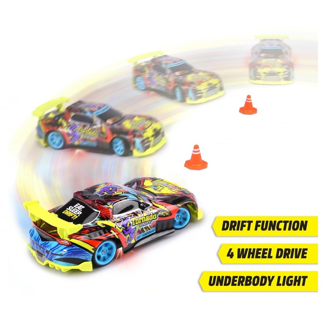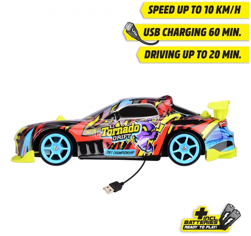 RC Tornado Drift er en firehjulstrukket bil med en tophastighed på 10 km/t. Desuden er der en turbo-knap, som giver bilen et ekstra boost.