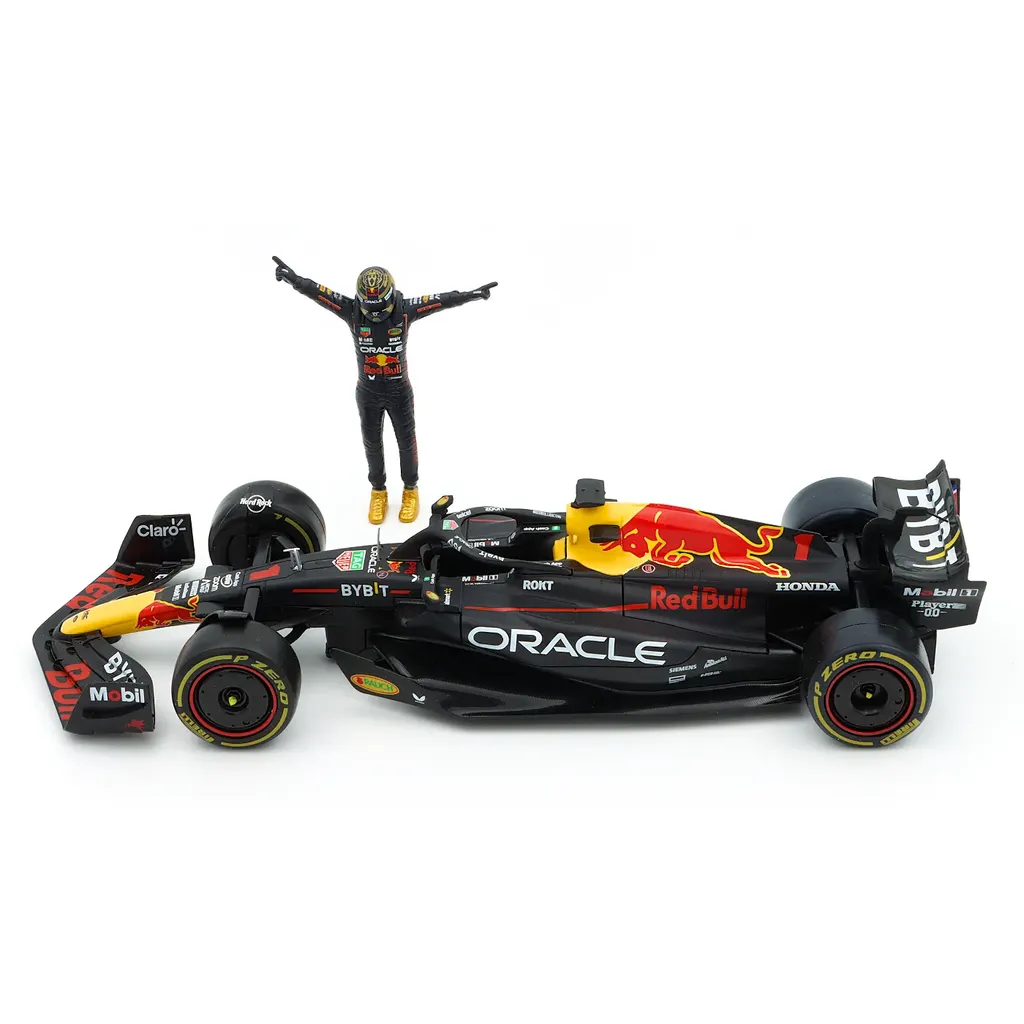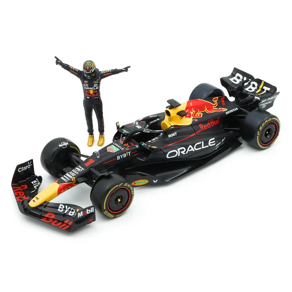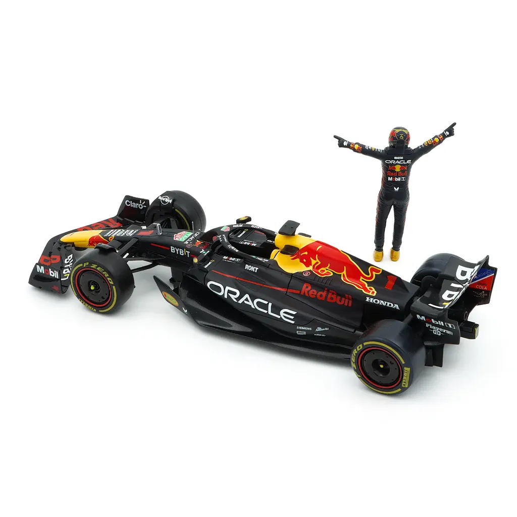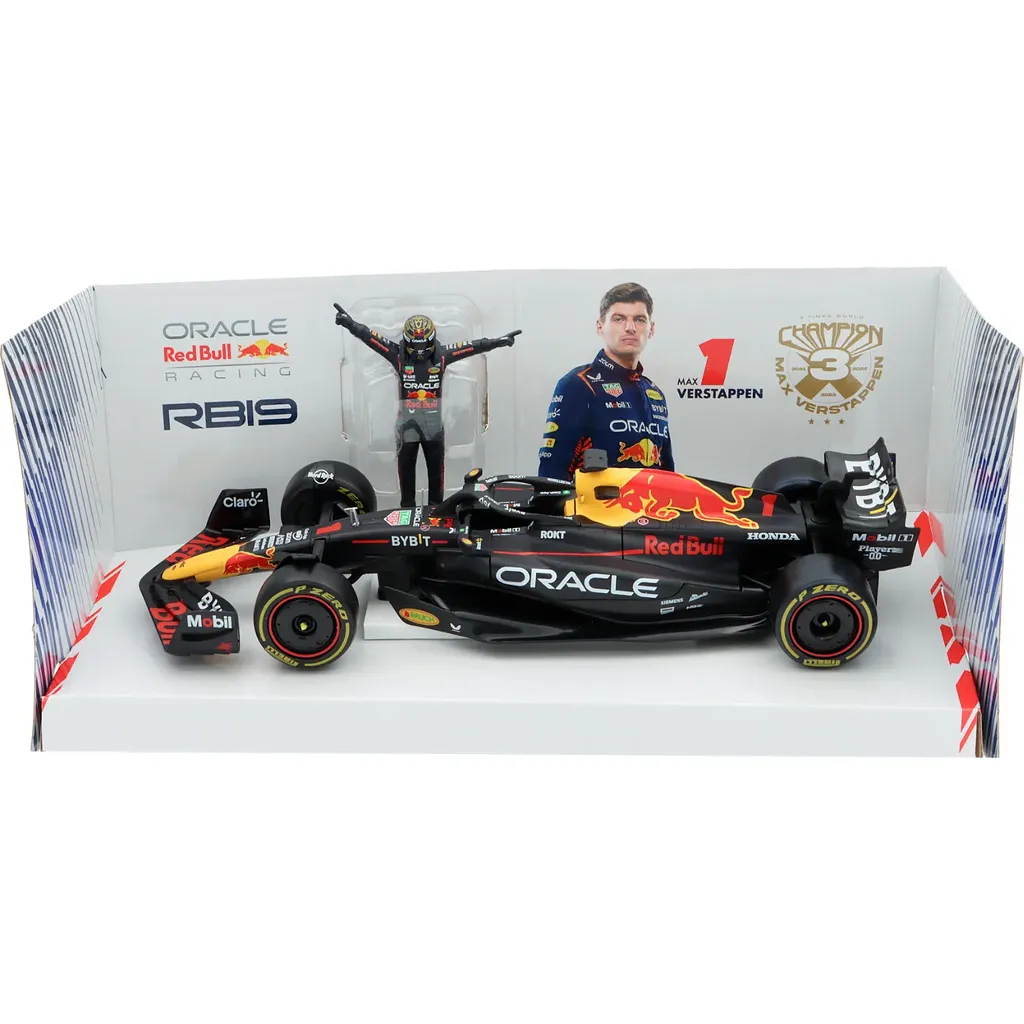 Max Verstappens 2023 F1-bil (RB19) som modelbil med Max selv som samlerfigur. Produktet er i skala 1:24 (24 cm længde på bilen og 9 cm højde på figuren) og fremstillet af italienske Bburago.