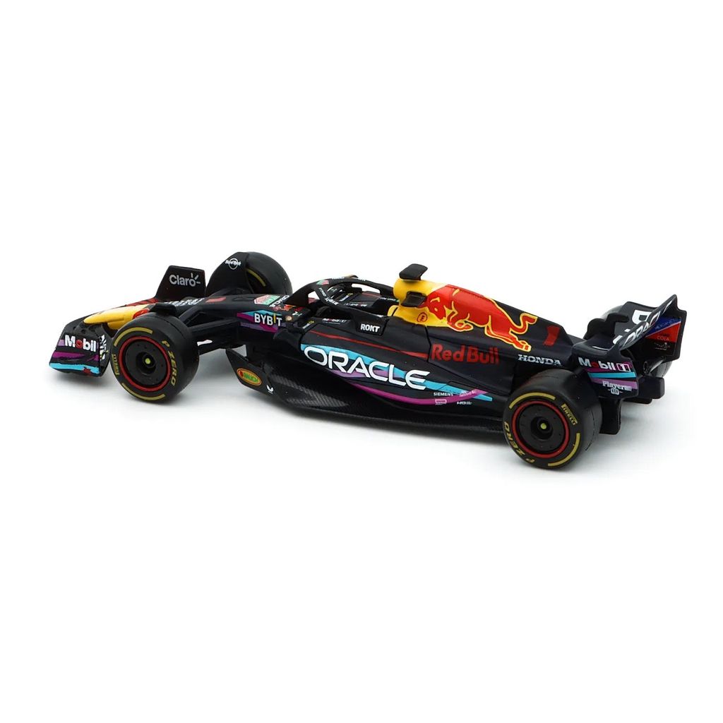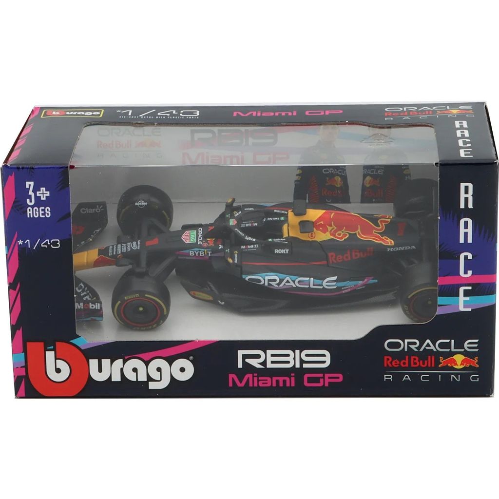 Model af RB19 Formel 1-bilen fra Red Bull. Denne bil med nummer 1 og denne pink-lilla-blå bemaling blev kørt under Miamis GP i 2023 af Max Verstappen, som vandt Miamis Grand Prix foran holdkammeraten Sergio Perez. Bilen er en del af Oracle Red Bull Racing-teamet fra Storbritannien.