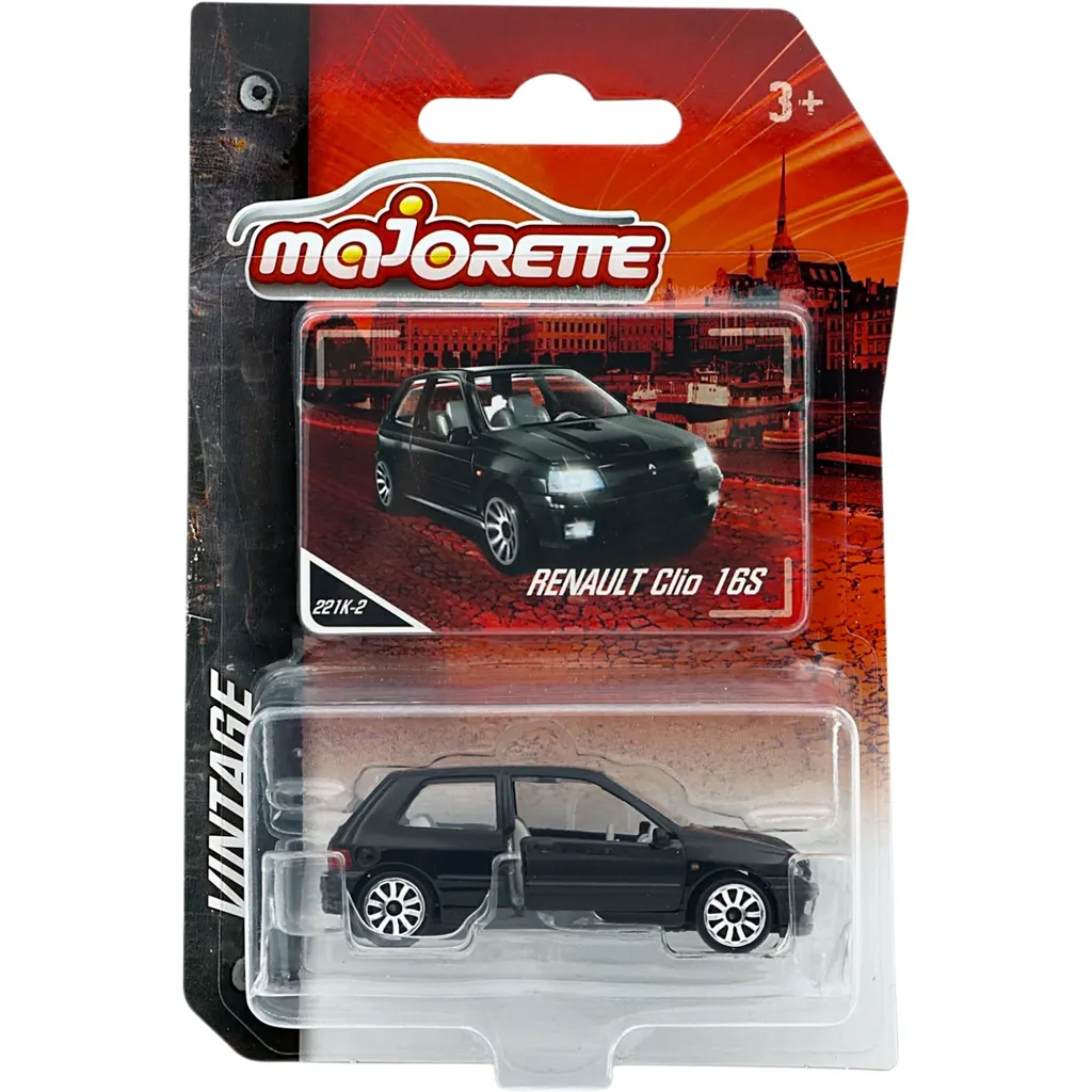 Sort Renault Clio 16S fra Majorette og Vintage-serien. Clio'en er 6,8 cm lang (skala 1:53).