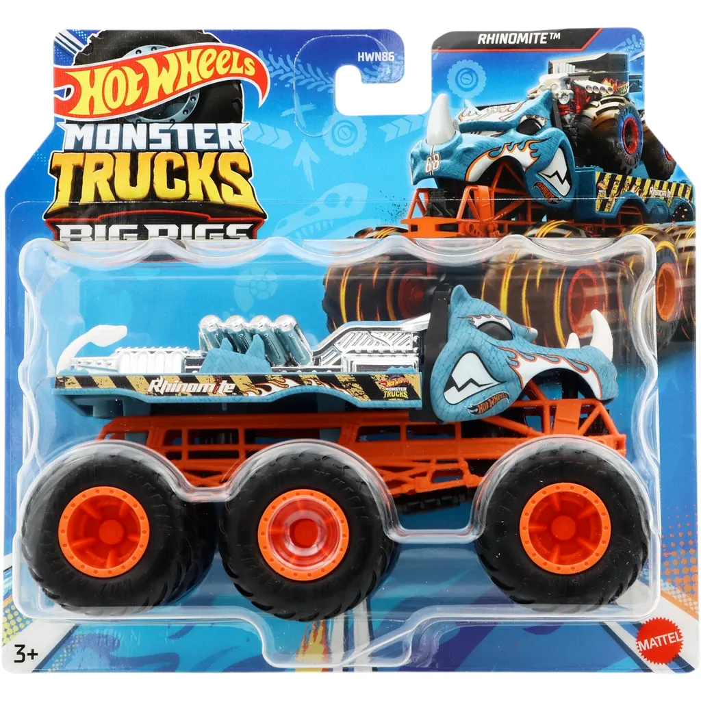 Rhinomite næsehorn og monster truck fra Hot Wheels og deres Big Rigs monster truck serie fra 2024. Big Rigs trucks har seks hjul.