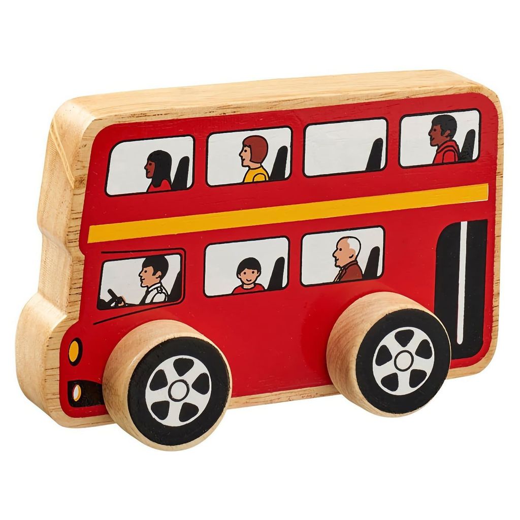 Bus / dobbeltdækker fremstillet af genbrugte gummitræer i Sri Lanka fra det britiske mærke Lanka Kade. Den røde bus er 2,5 cm tyk (5,8 cm total bredde med hjulene lidt tyndere end selve bussen) og er af høj kvalitet. Naturligt malet med giftfri maling på begge sider af dobbeltdækkerbussen.
