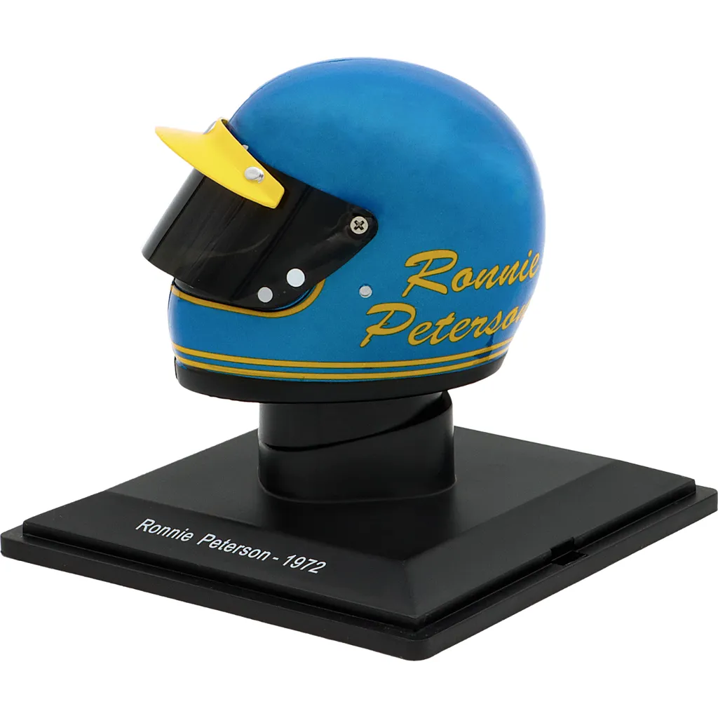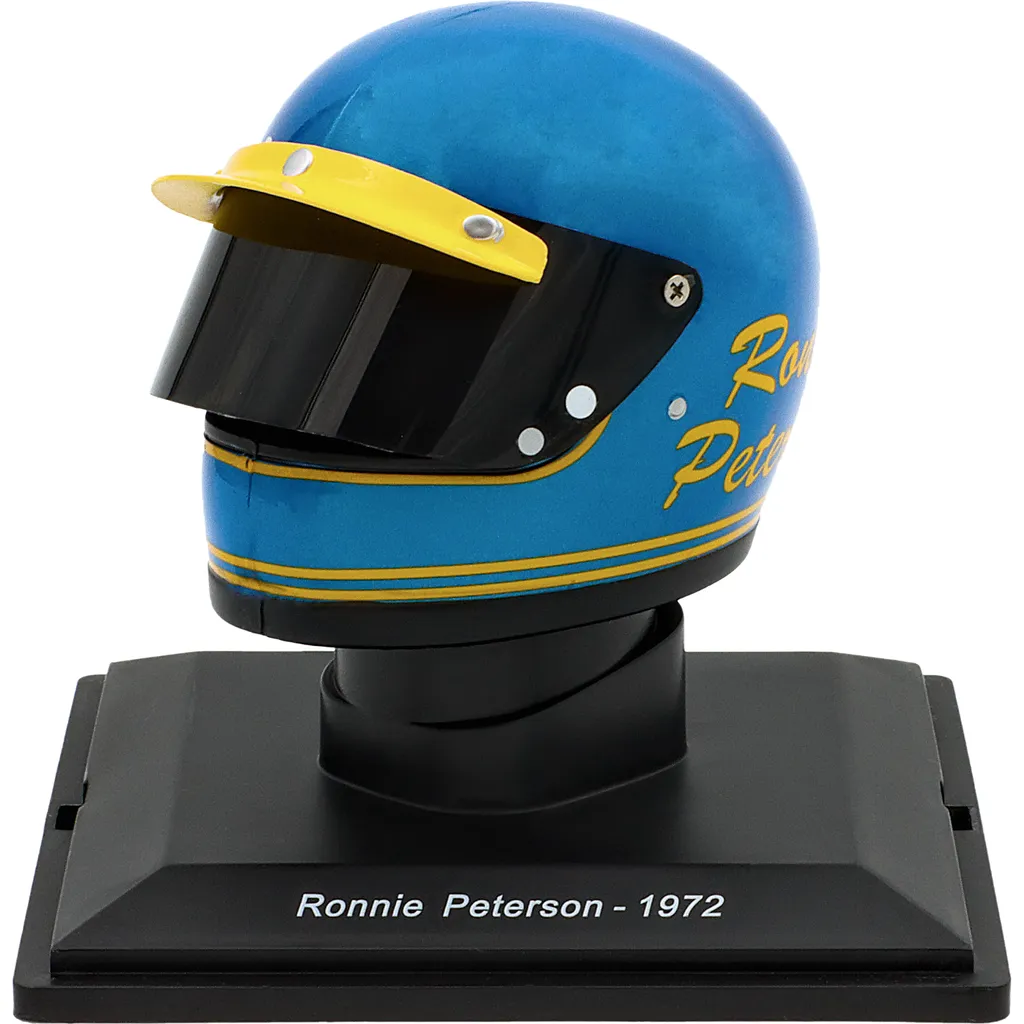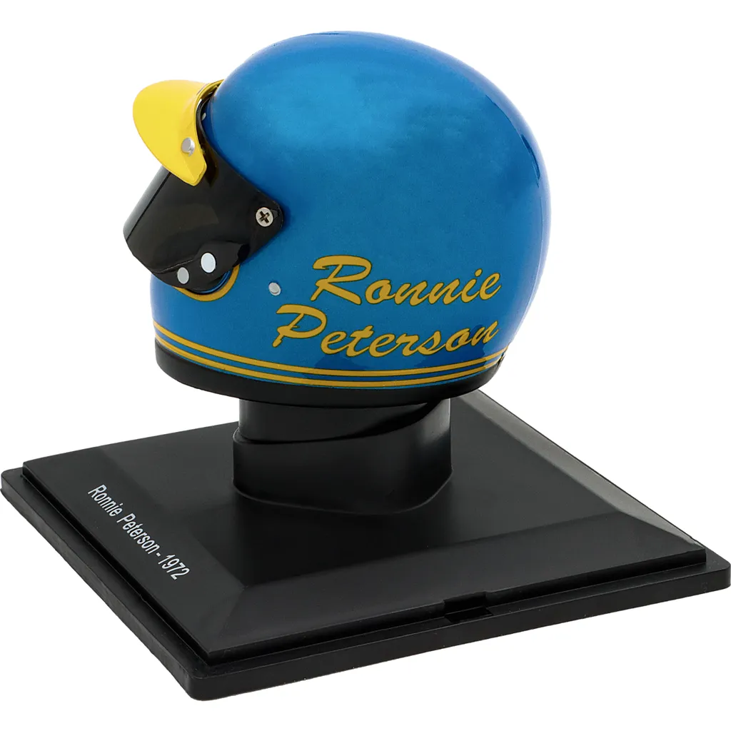 Ronnie Petersons blå og gule hjelm fra 1972, da han kørte for Ferrari og vandt verdensmesterskabet i sportsvogne i Buenos Aires og på Nürburgring. Hjelmen er en model i skala 1:5 (ca. 7 cm lang og 5 cm høj).