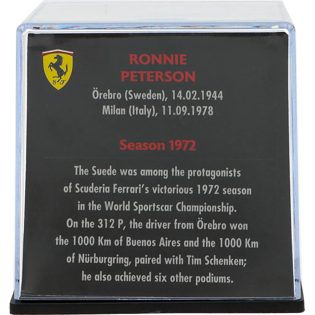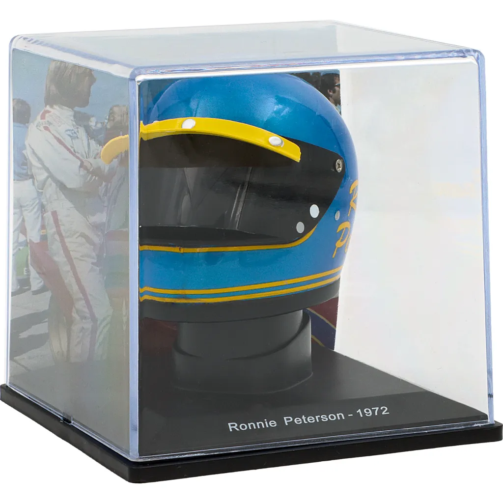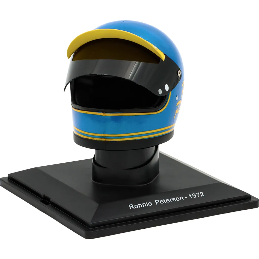 Ronnie Petersons blå og gule hjelm fra 1972, da han kørte for Ferrari og vandt verdensmesterskabet i sportsvogne i Buenos Aires og på Nürburgring. Hjelmen er en model i skala 1:5 (ca. 7 cm lang og 5 cm høj).