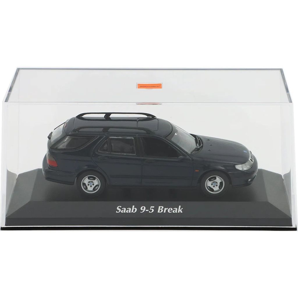 Modelbilen er placeret på en sort bundplade med modelnavnet "Saab 9-5 Break" i sølv. Bil og plade er dækket af en akrylboks.