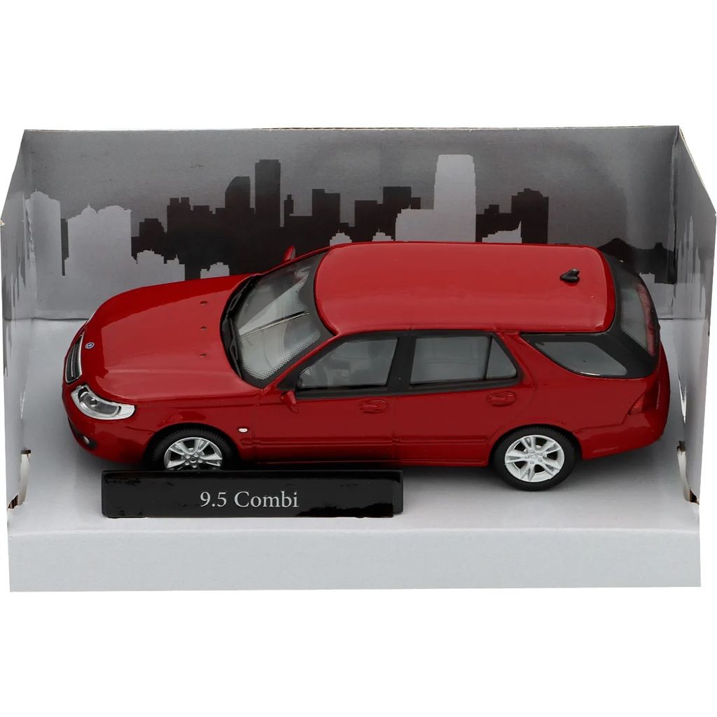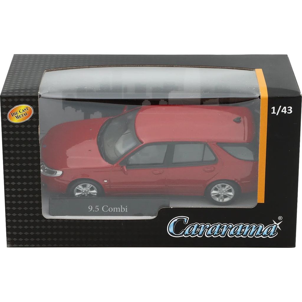 Saab 9-5 Kombi i rød som model fra Cararama. Skalaen er 1:43, hvilket betyder, at denne Saab er 11,3 cm. Modelåret anslås til at være omkring 2007-2008 ifølge en af vores kunder, men producenten angiver 1998, hvilket er forkert.
