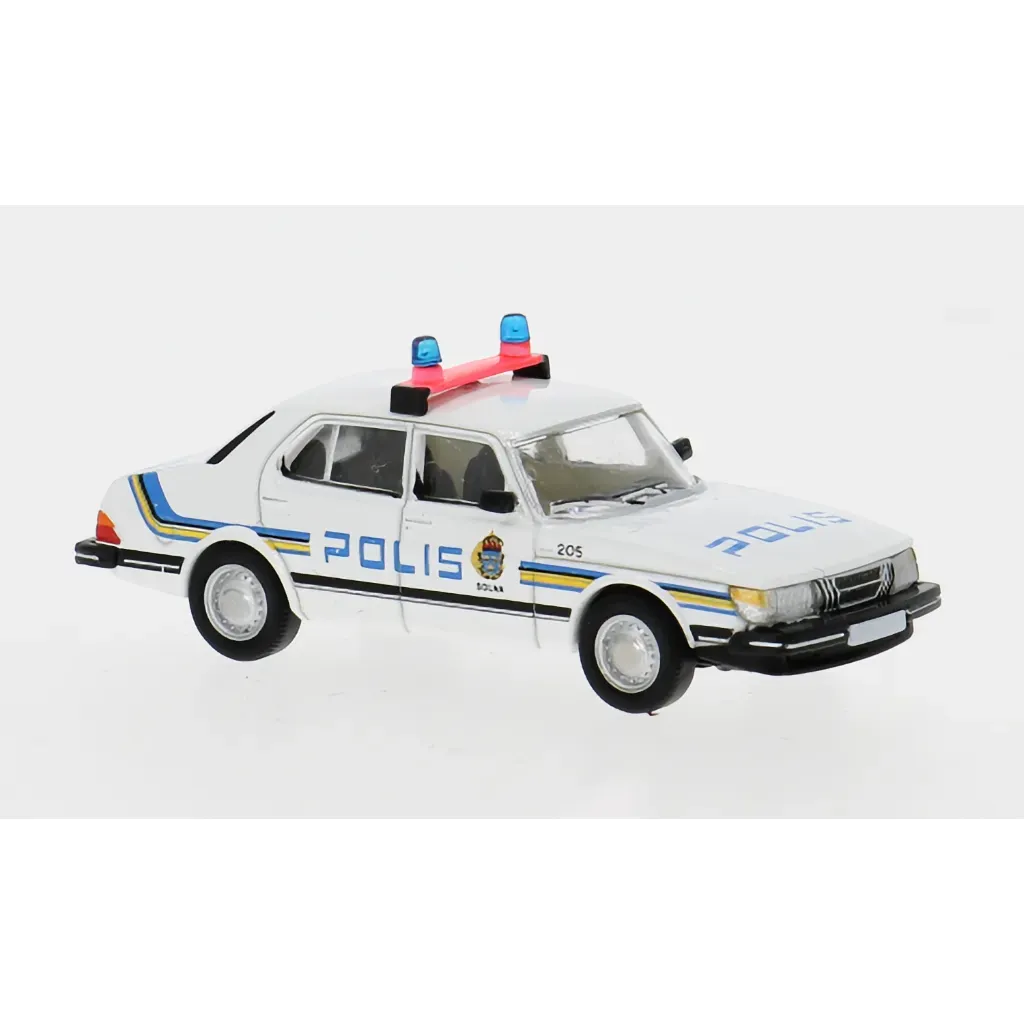 Saab 900 som svensk politibil fra PCX87. Skalaen er 1:87, hvilket betyder, at denne Saab-model er 5,3 cm lang. Skalaen passer godt sammen med modeljernbaner i f.eks. skala 1:87/H0.