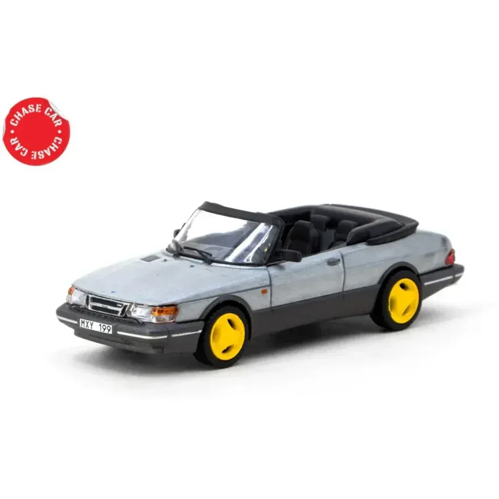Gul Saab 900 Turbo Convertible fra Tarmac Works i skala 1:64 (ca. 7 cm). Bilen er en del af Tarmacs GLOBAL64-serie.