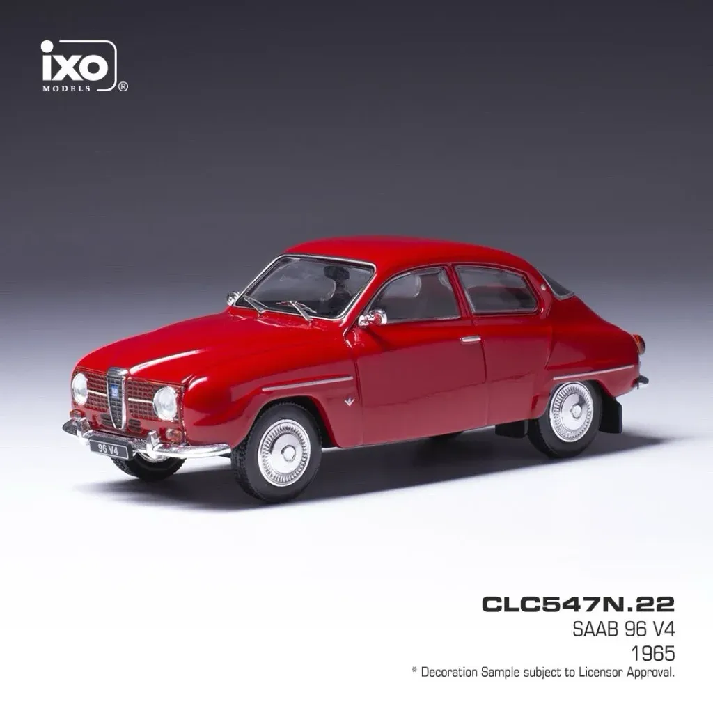 Saab 96 V4 (modelår 1968) i rød som modelbil fra Ixo Models. Modellen er i skala 1:43 (10 cm).