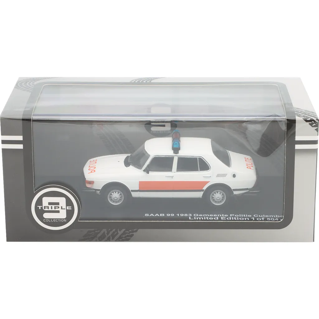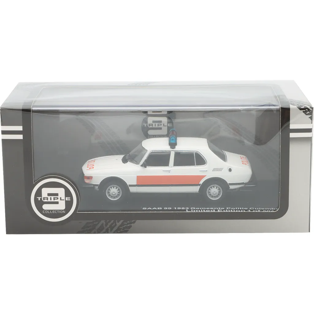 Modelbilen står på en sort bundplade med teksten "SAAB 99 1983 Gemeente Politie Culemborg Limited Edition 1 of 504 pcs".