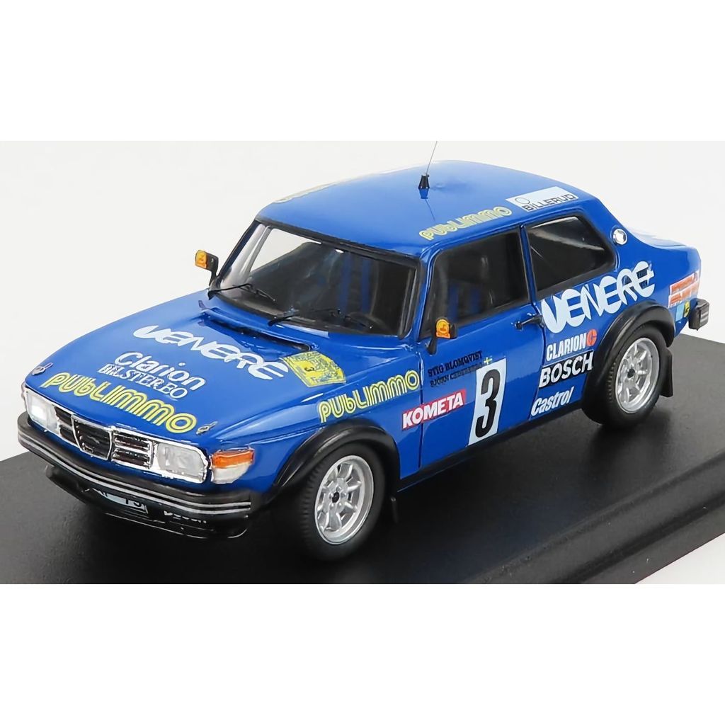 Blå Saab 99 Turbo rallybil som model i skala 1:43. Bilen blev kørt af Blomqvist og Cederberg i det svenske rally i 1981.