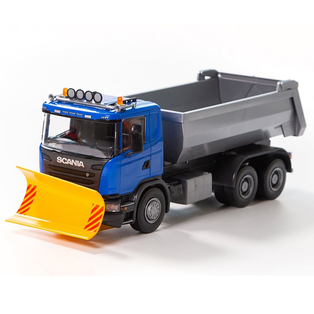Blå Scania-plovvogn med tippelad fra det finske mærke EMEK. Plovvognen er 34 cm (skala 1:25).