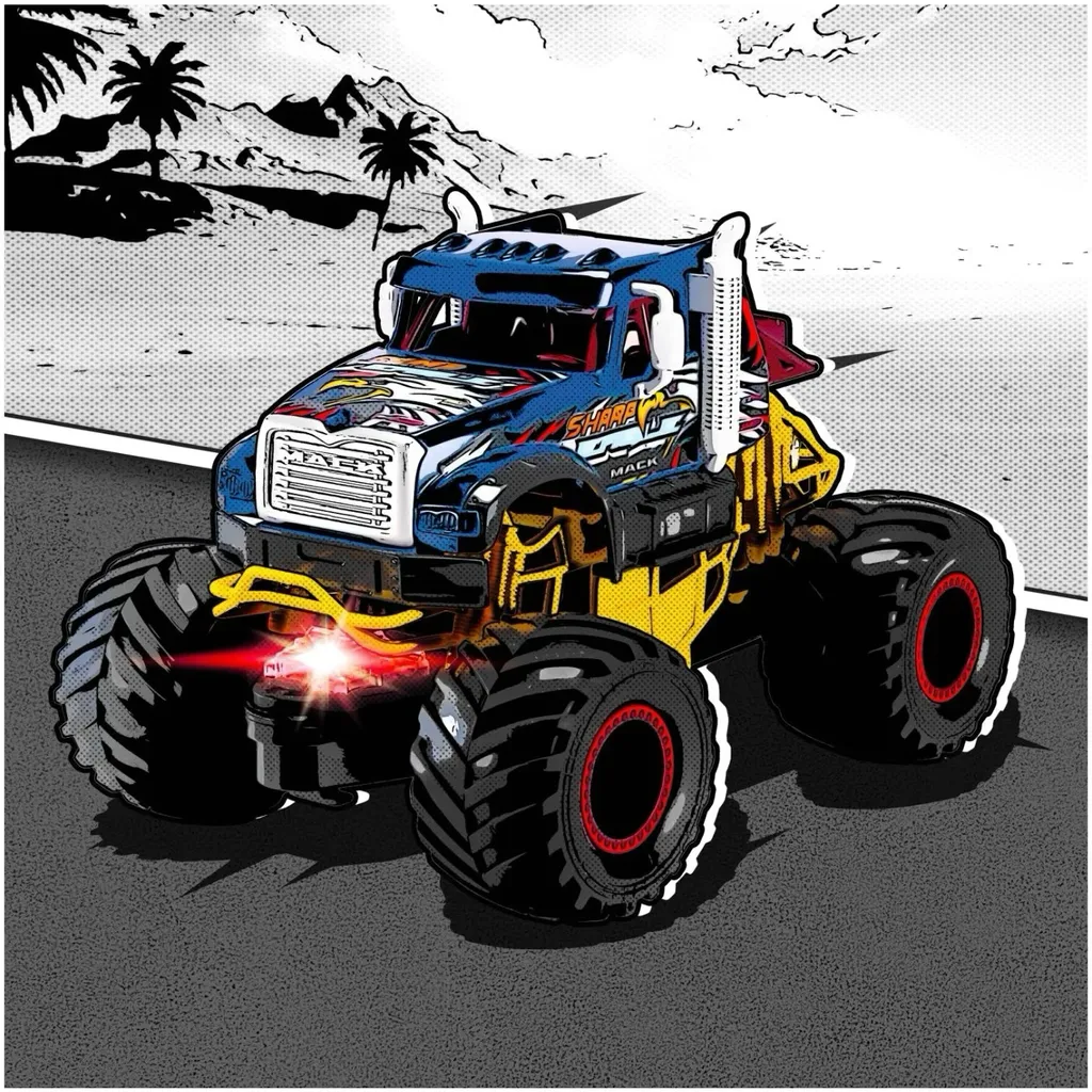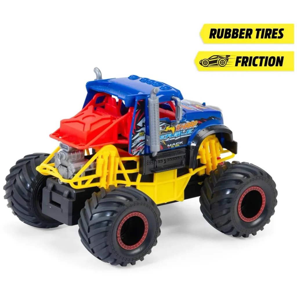 Monstertrucken har en friktionsmotor, der giver trucken ekstra fart, når den skubbes fremad eller bagud.